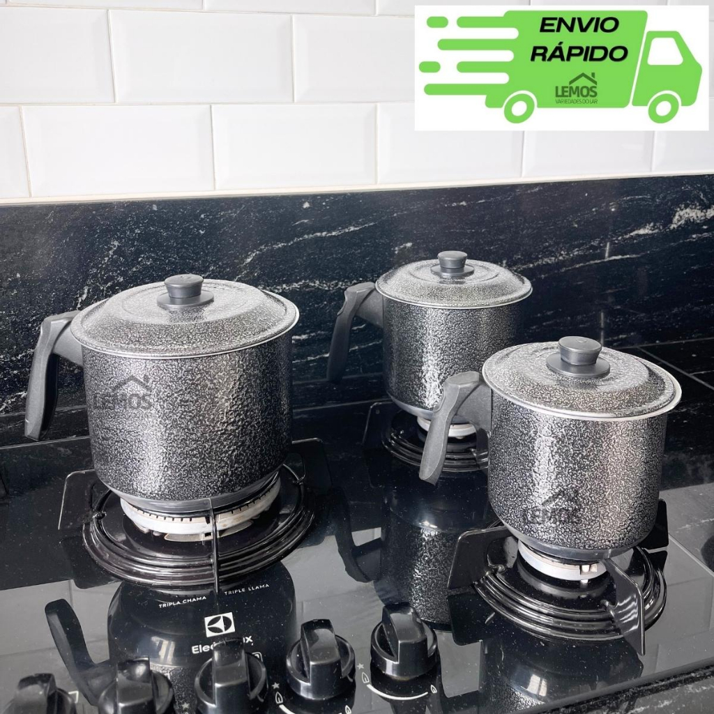 Jogo Com 3 Peças Fervedor Em Aluminio Com Tampa N12-14-16 Leiteira Caneco Preto Craqueado ou Vermelho