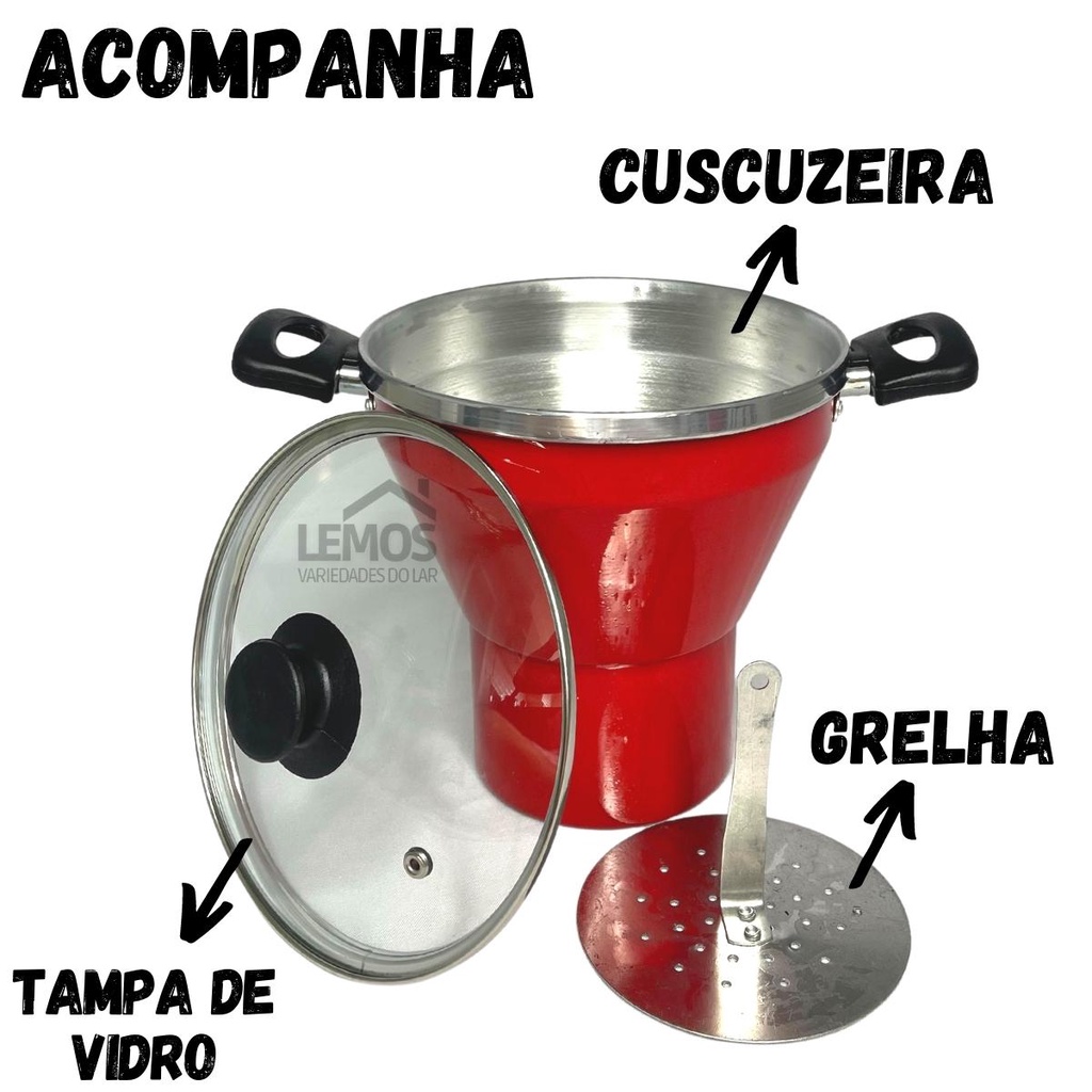 Caçarola Cuscuzeira Vermelha Com Tampa de Vidro N18 Em Alumínio Faz Cuscuz Nordestino Alimentos A Vapor
