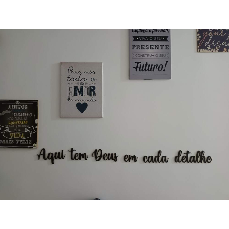 Frase Decorativa Aqui tem Deus em cada Detalhe feito em MDF Preto de 3mm Promoção