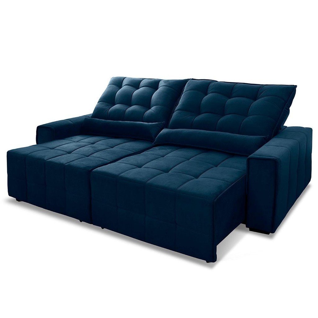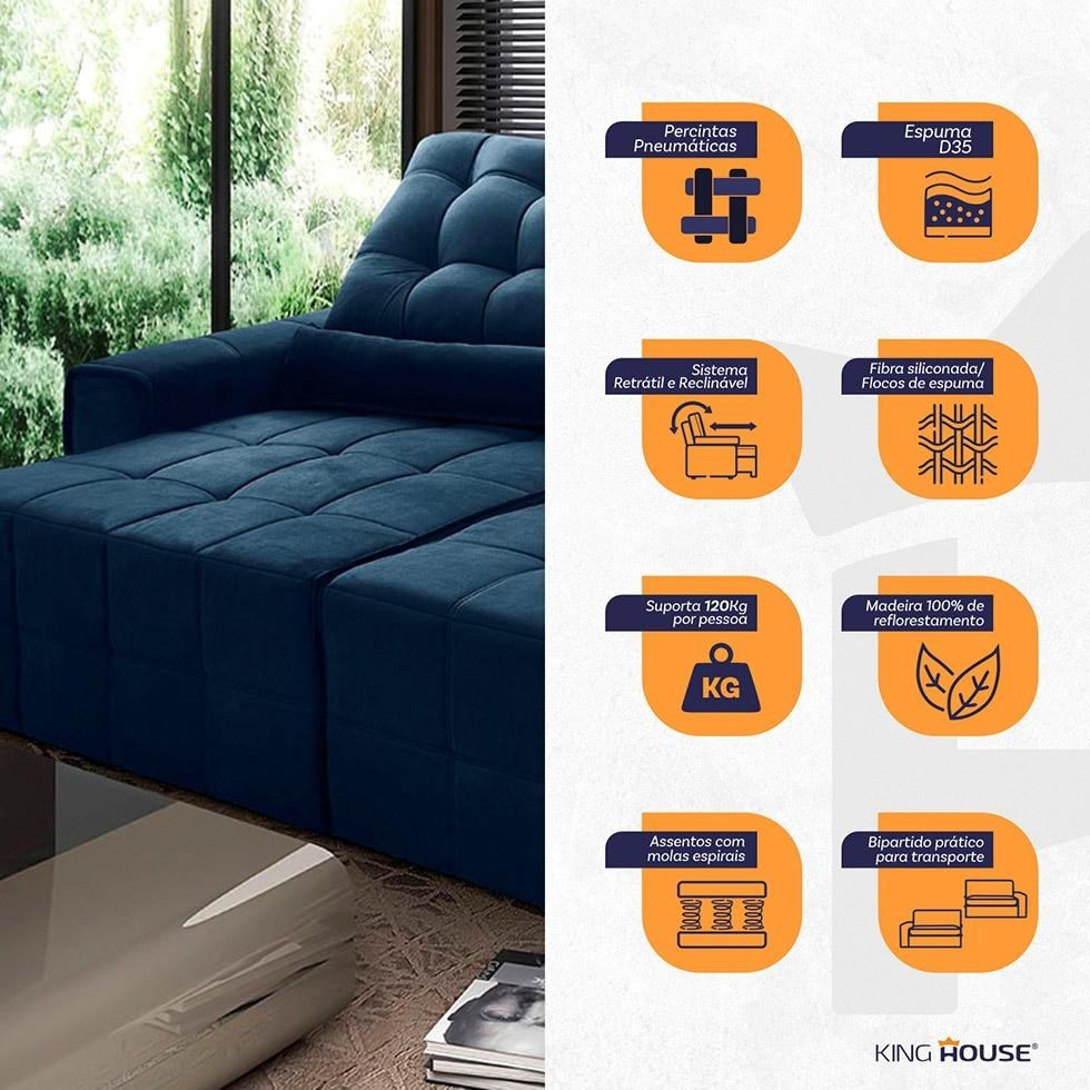 Sofá Retrátil Reclinável Alaska 2,50m Suede Velut Azul Marinho Molas no Assento - King House