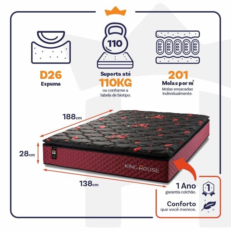 Colchão c/ Molas Ensacadas Toronto Casal 138x188x28 Vermelho