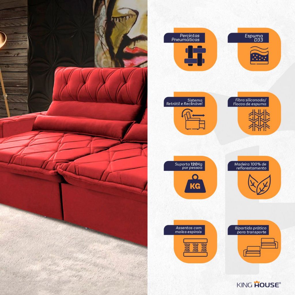 Sofá Retrátil Reclinável França 2,10m Suede Velut Vermelho Molas no Assento - King House