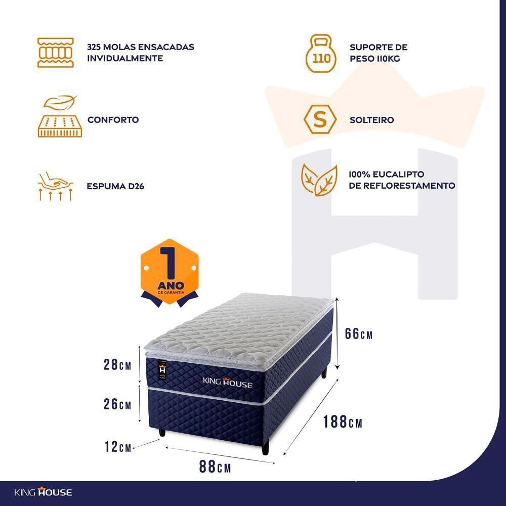 Conjunto Cama Box Solteiro Lagras 88x188x66 Azul c/ Molas Ensacadas