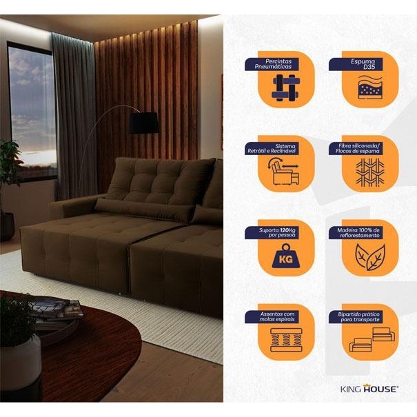 Sofá Retrátil Reclinável Montebello 2,50m Suede Velut Marrom Molas no Assento - King House