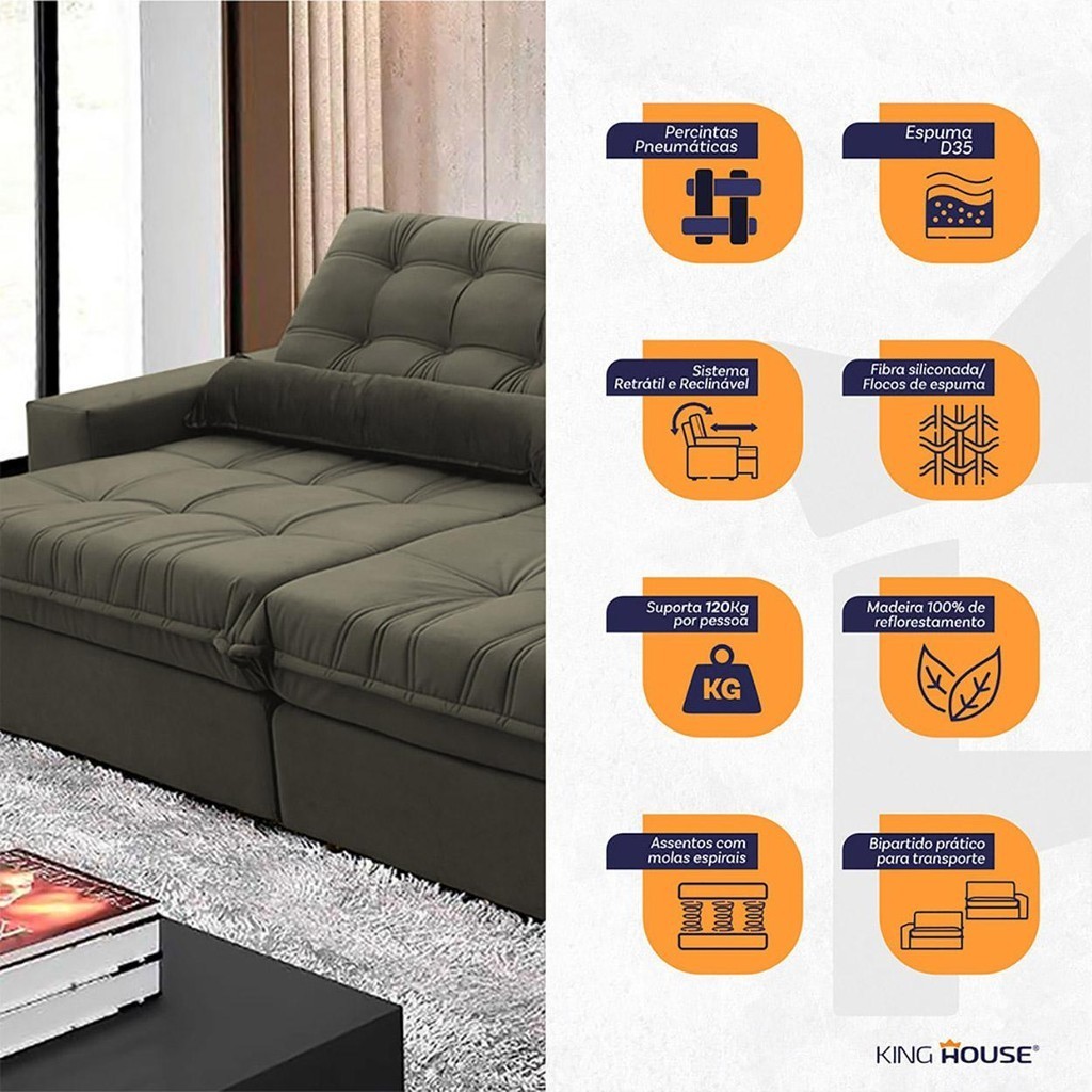 Sofá Retrátil Reclinável Zurique 2,30m Suede Velut Tabaco c/ Molas no Assento - King House