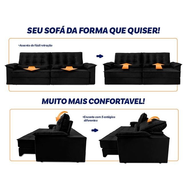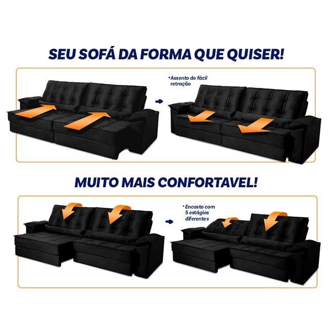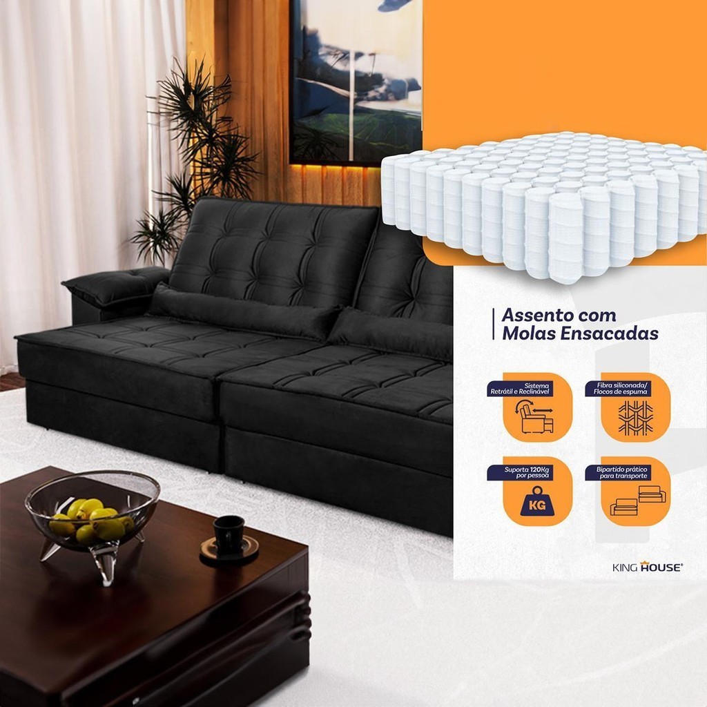Sofá Retrátil Reclinável 3,00m Ascari Suede Velut Preto molas Ensacadas - King House