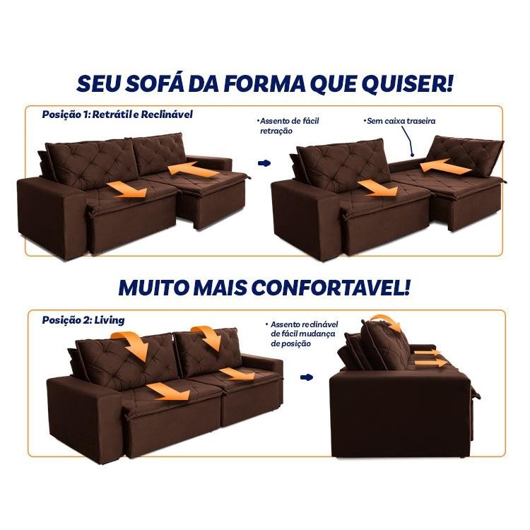 Sofá Cama Bangkok Sem Caixa 2,50m Retrátil e Reclinável Com Molas Velut Marrom- King House