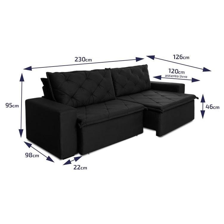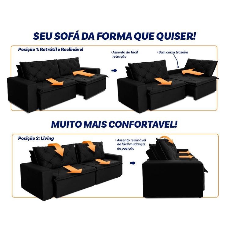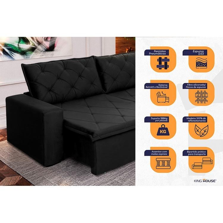 Sofá Cama Bangkok Sem Caixa 2,30m Retrátil e Reclinável Com Molas Velut Preto- King House