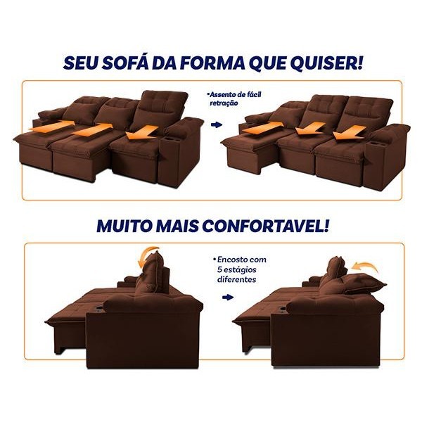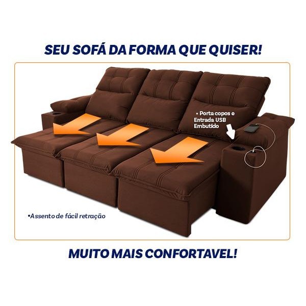 Sofá Retrátil Reclinável Verona USB + Porta Copo 2,30m Suede Velut Marrom c/ Molas no Assento