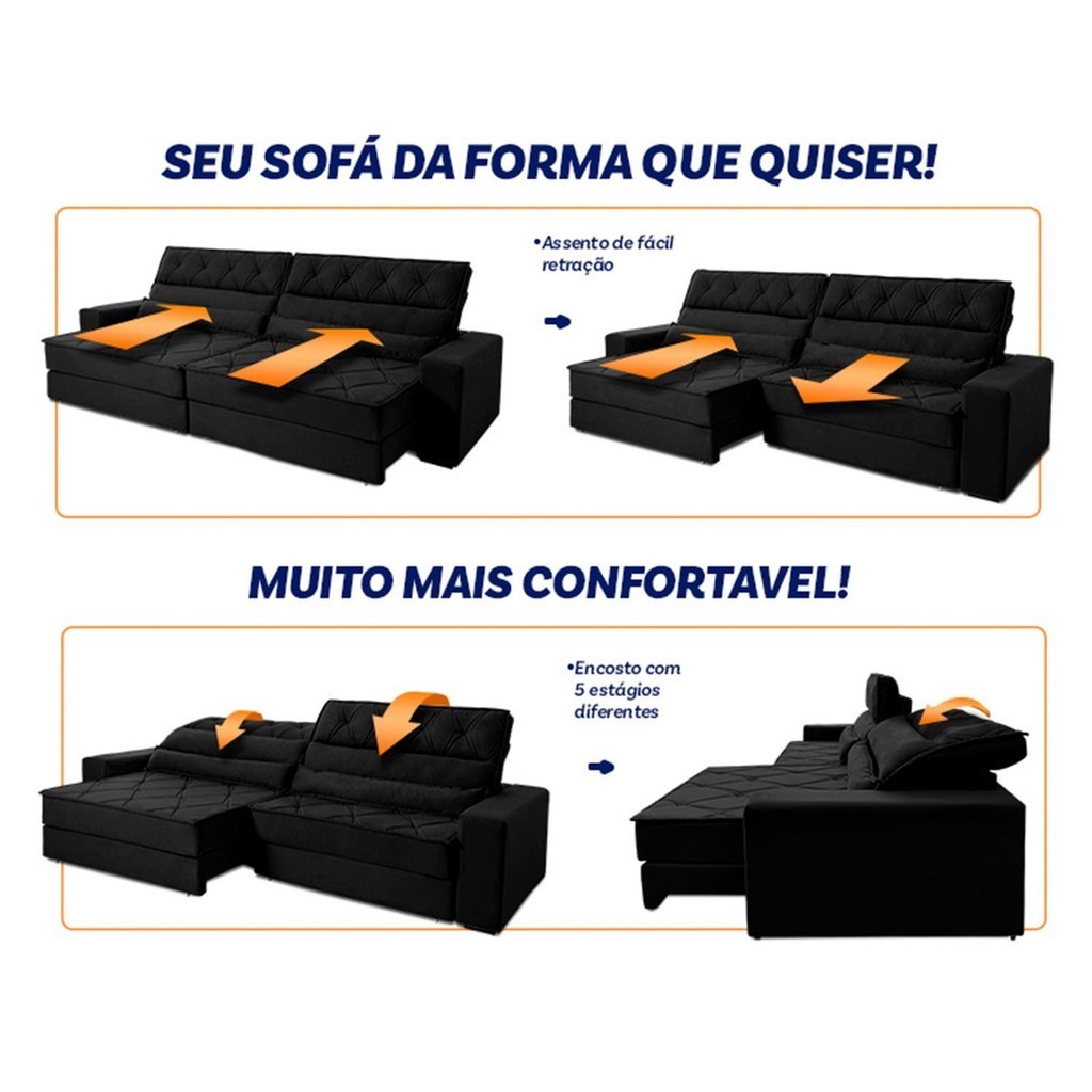 Sofá Retrátil Reclinável 3,00m Albany Suede Velut Preto Molas Ensacadas - King House