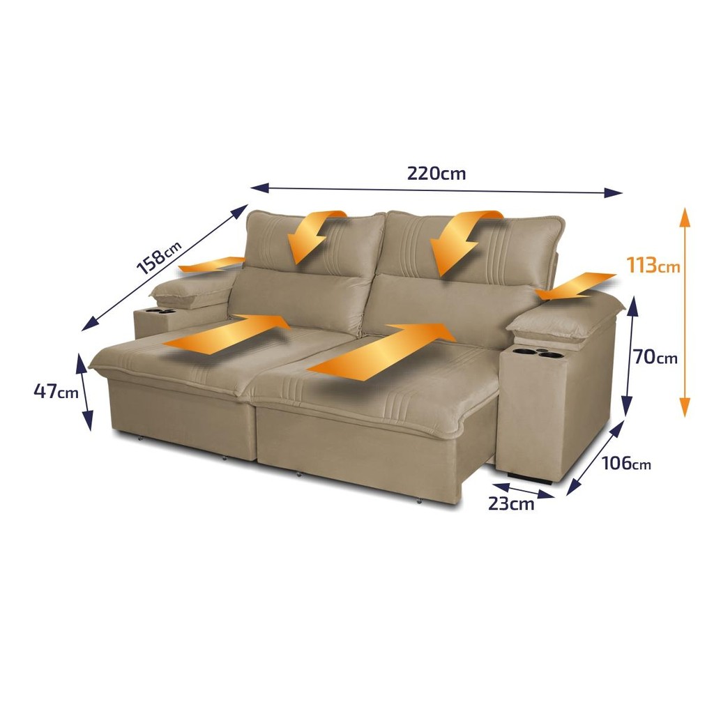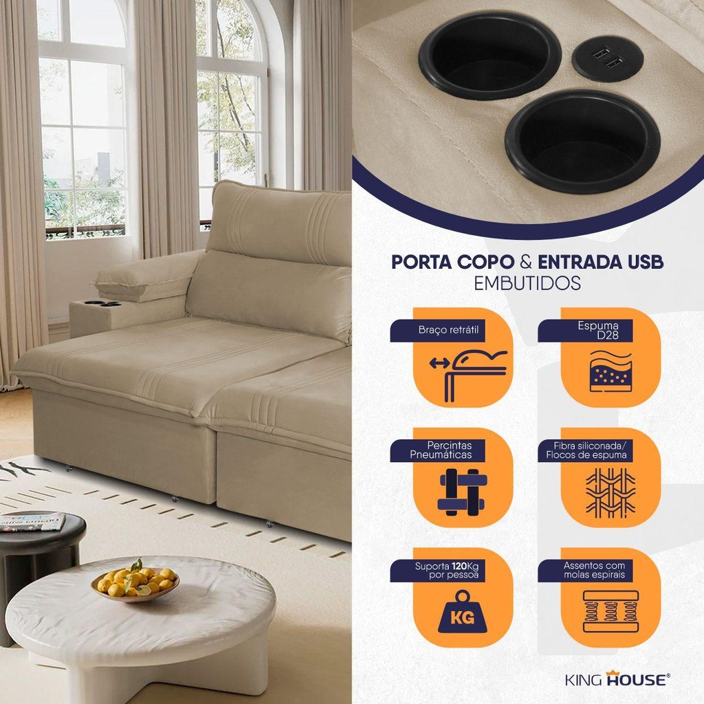 Sofá Retrátil Tesla 2,20m USB e Porta Copo Suede Bege