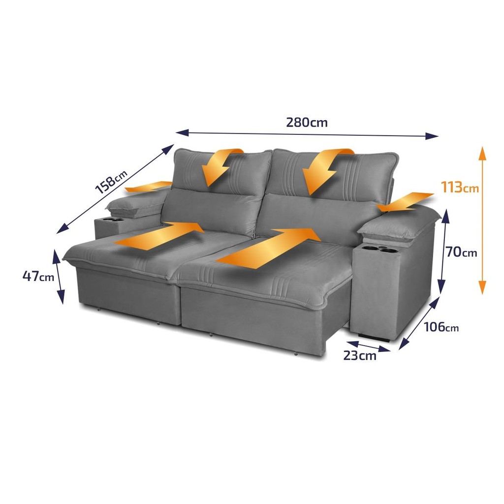 Sofá Retrátil Tesla 2,80m USB e Porta Copo Suede Cinza