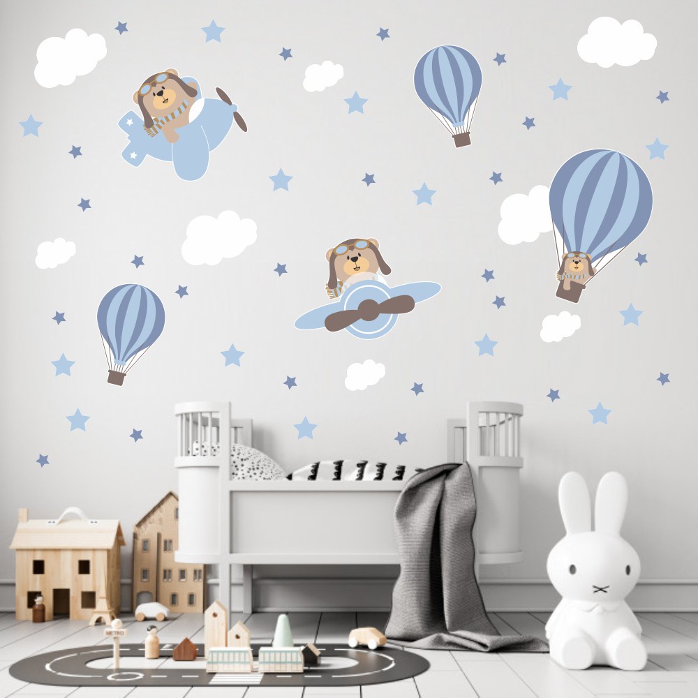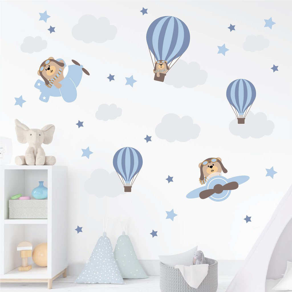Adesivos de Parede Infantil Urso Aviador baloeiro azul claro decoração quarto bebe