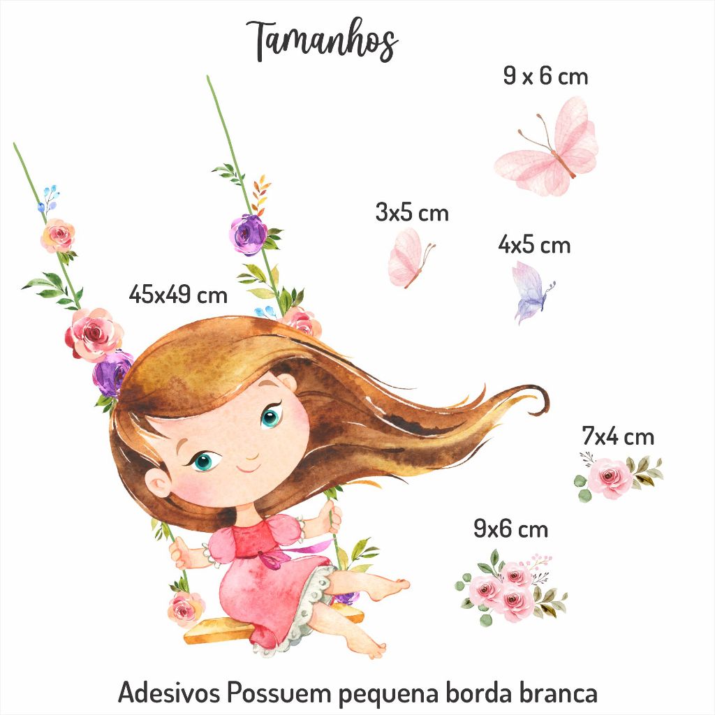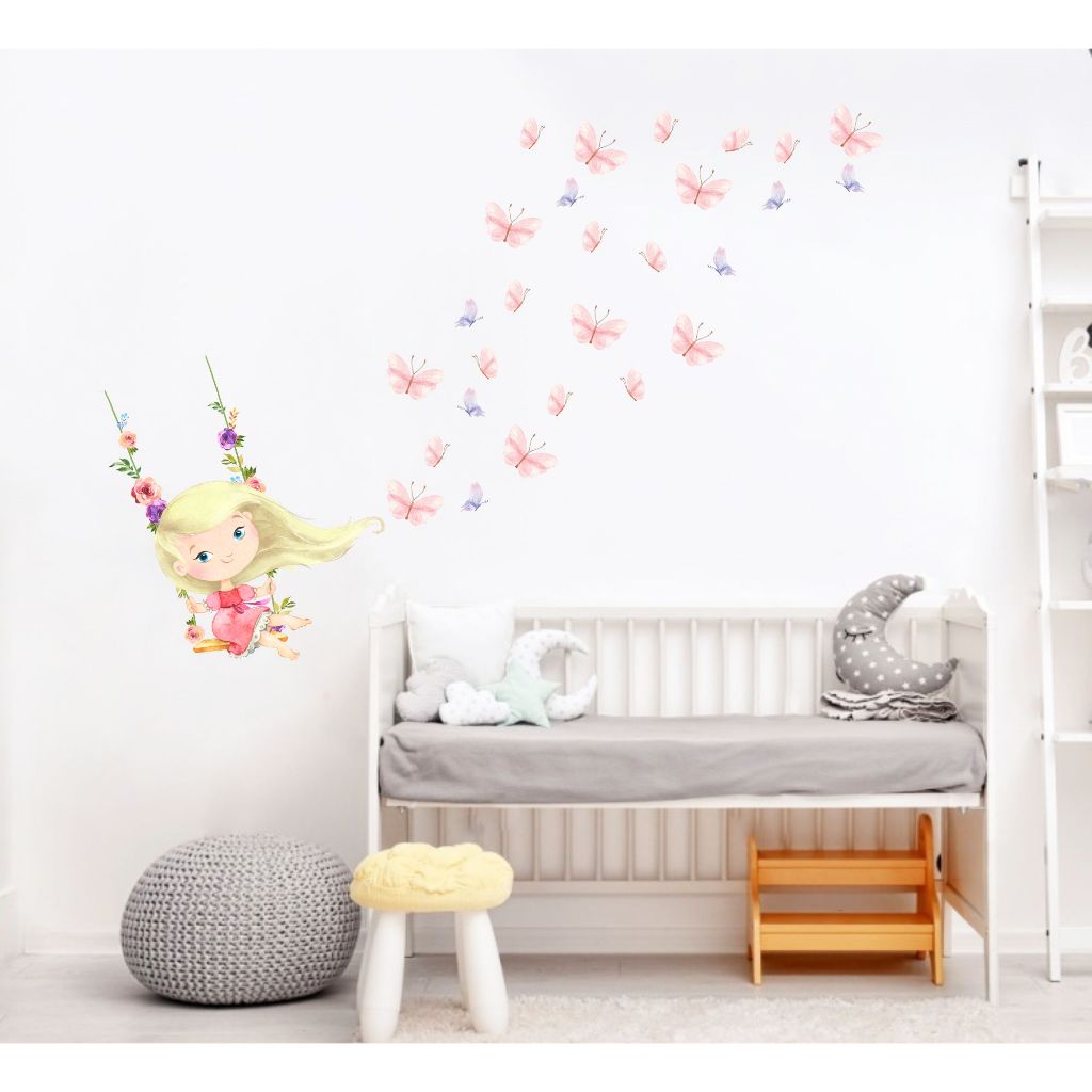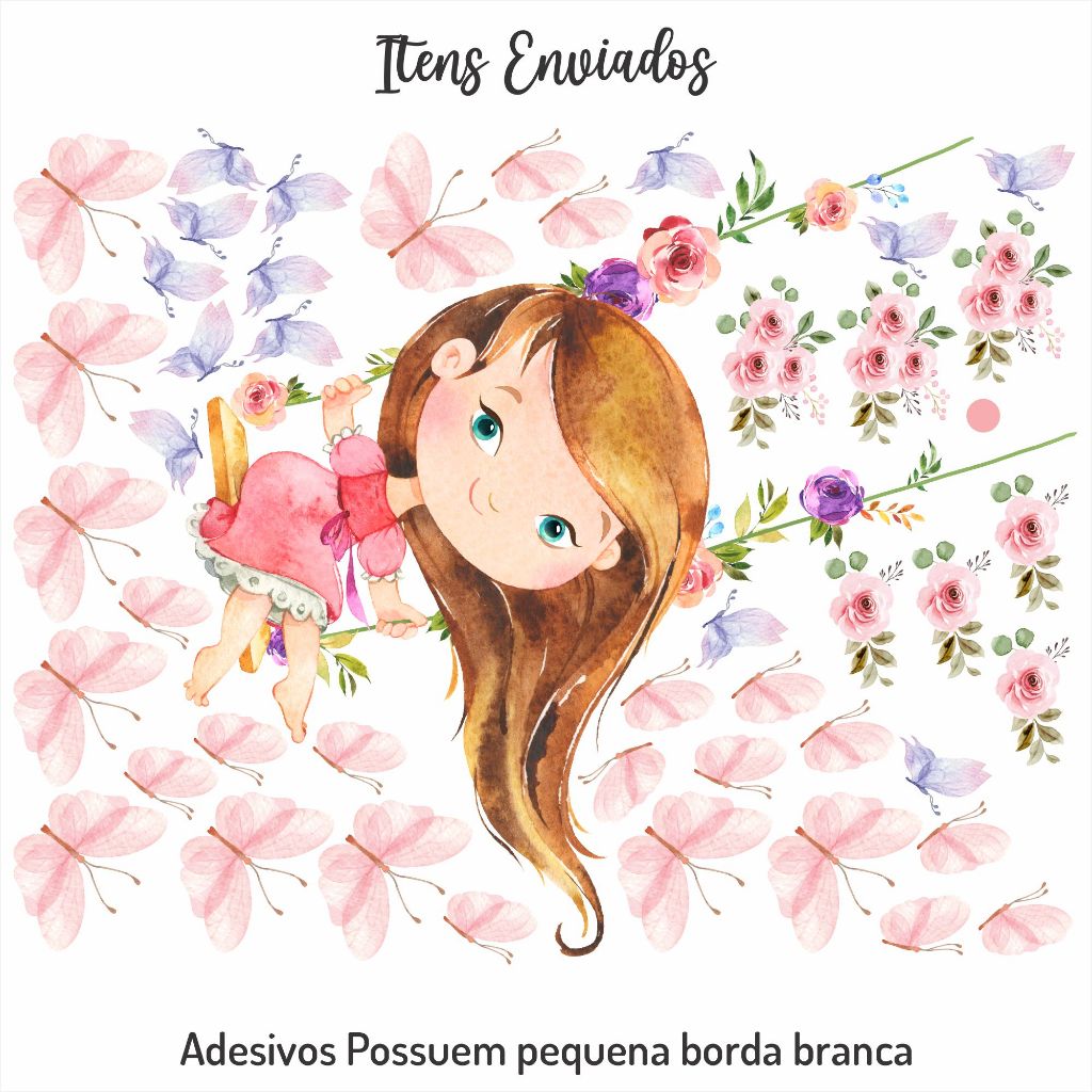 Adesivos de Parede Infantil Menina no Balanço, Flores e Borboletas Quarto de bebê