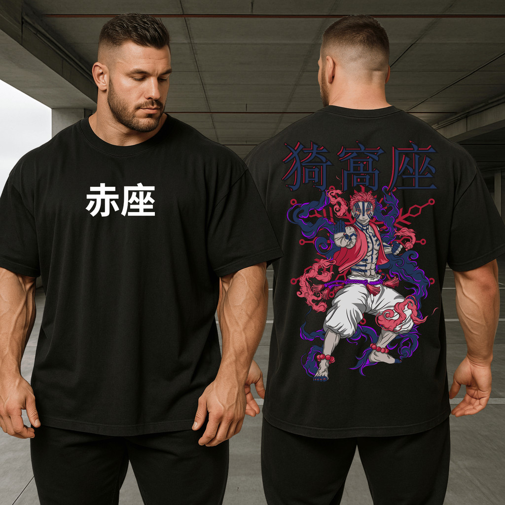 Camiseta Larga Oversized Demon Slayer Akaza Terceira Lua Superior Kimetsu No Yaiba Streetwear