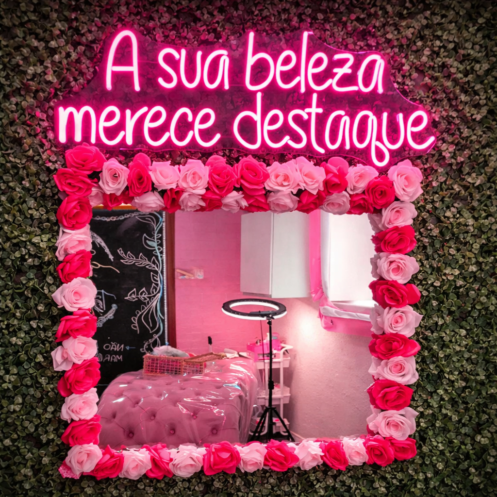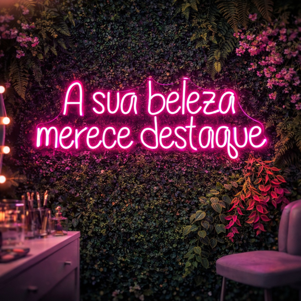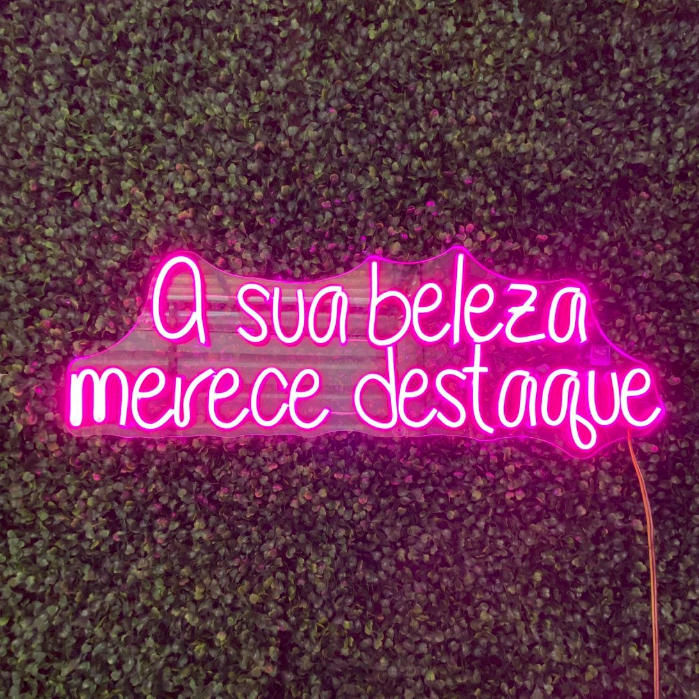 Letreiro SUA BELEZA MERECE DESTAQUE em Neon LED 65x25cm Frase Decoração Estética Painel