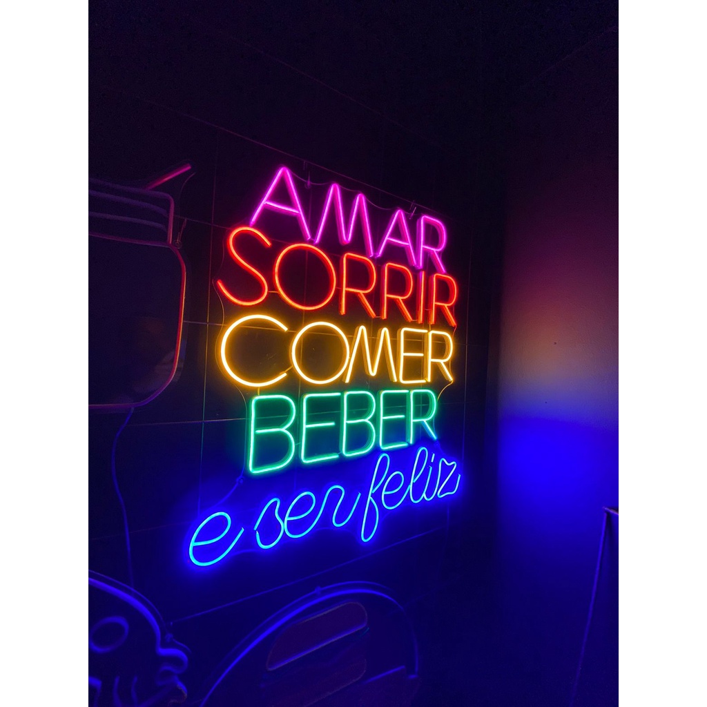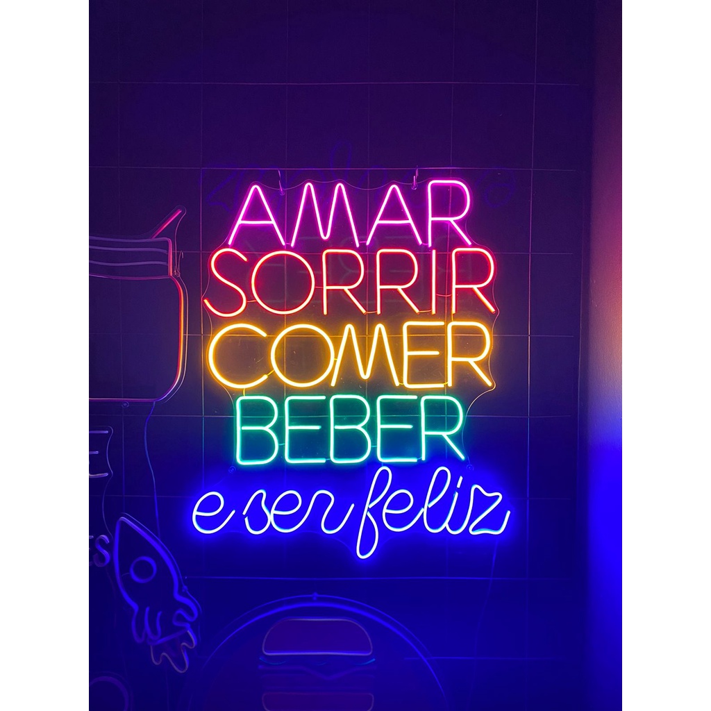 Frase "Amar, Sorrir, Comer, Beber e Ser Feliz" 50x60cm Letreiro em Neon Decoração Led Restaurantes