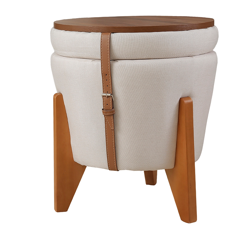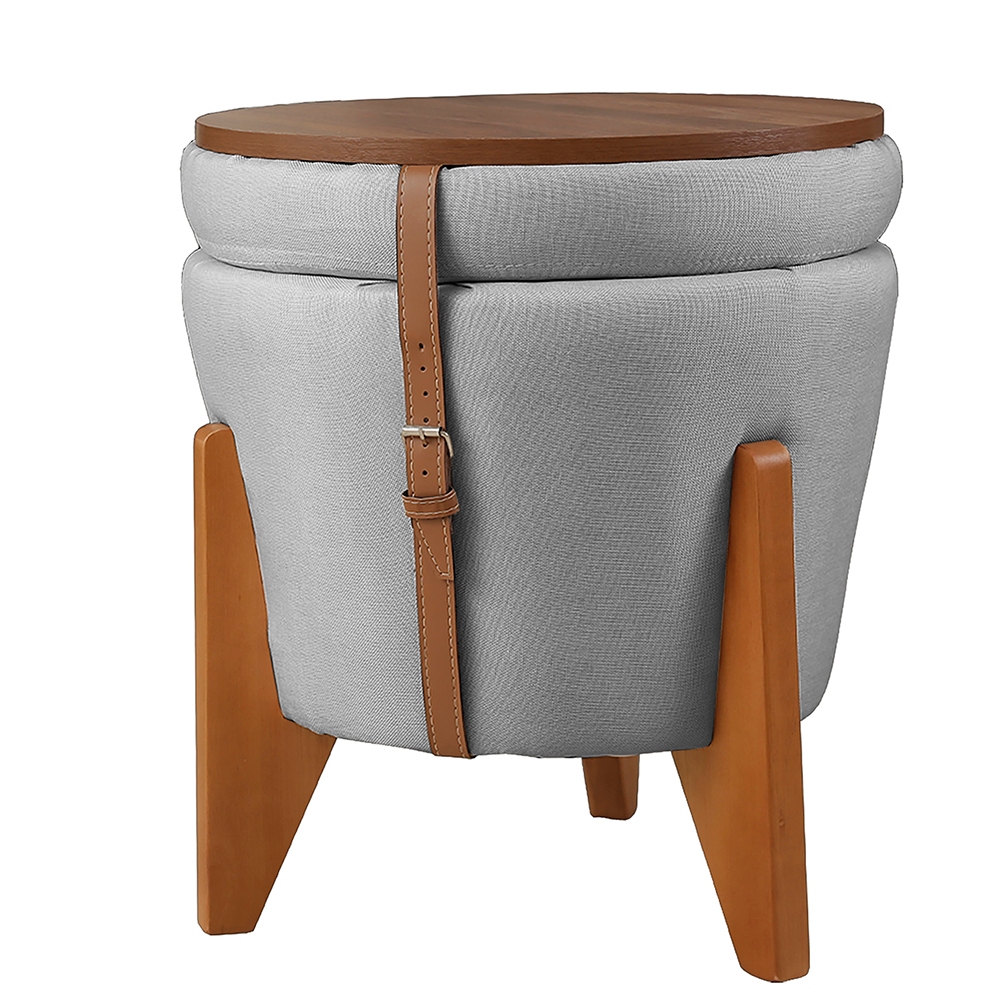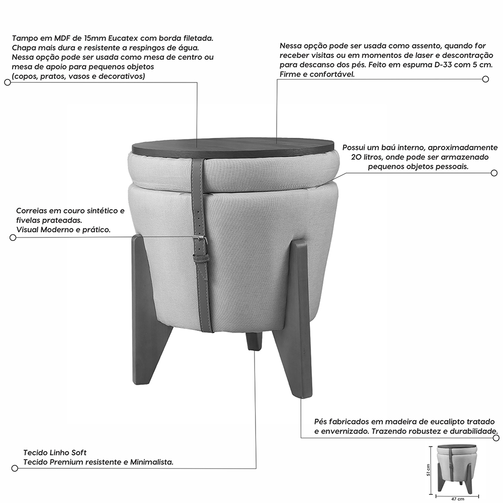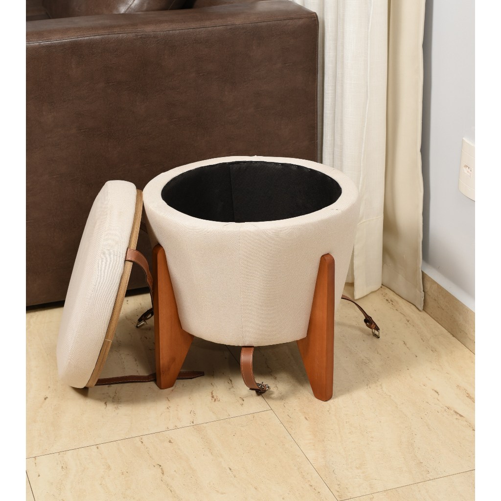 Puff Baú e Mesa Centro Luxo Redondo Banco Funcional Moderno Linho 3 em 1 Madeira Maciça
