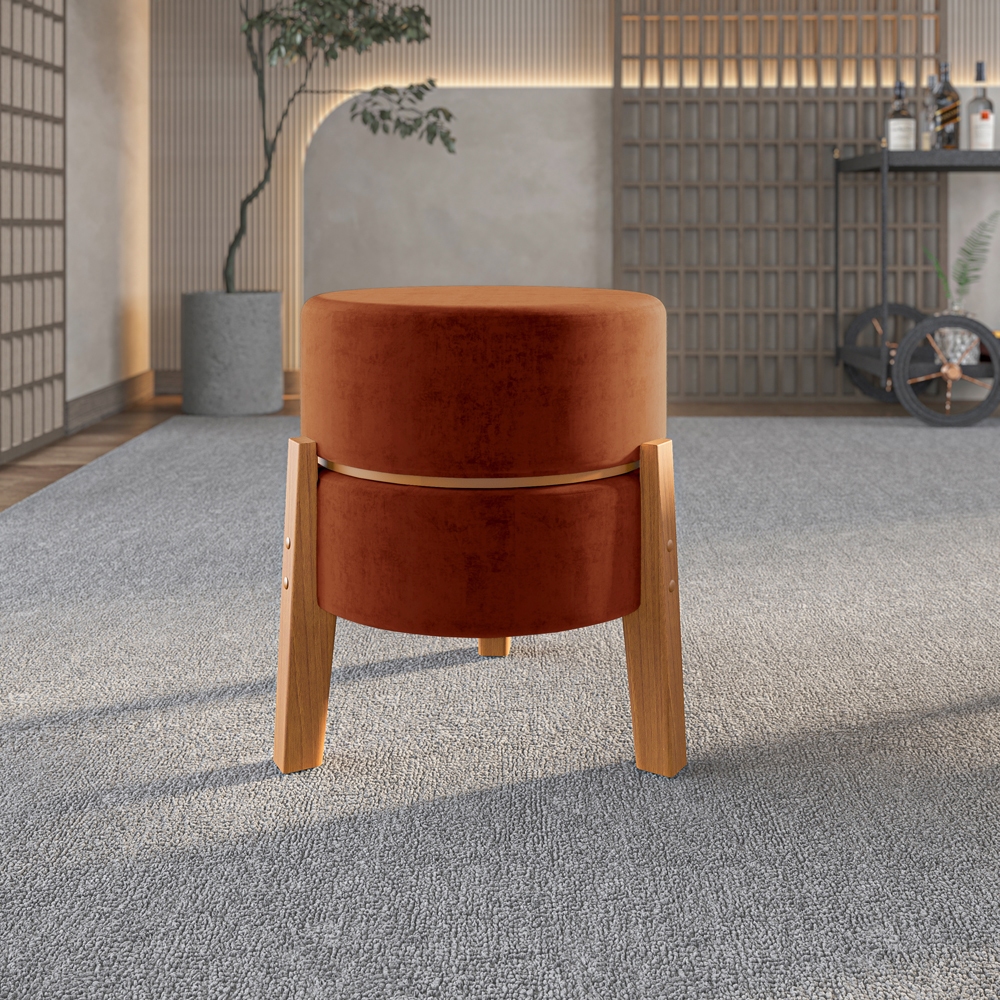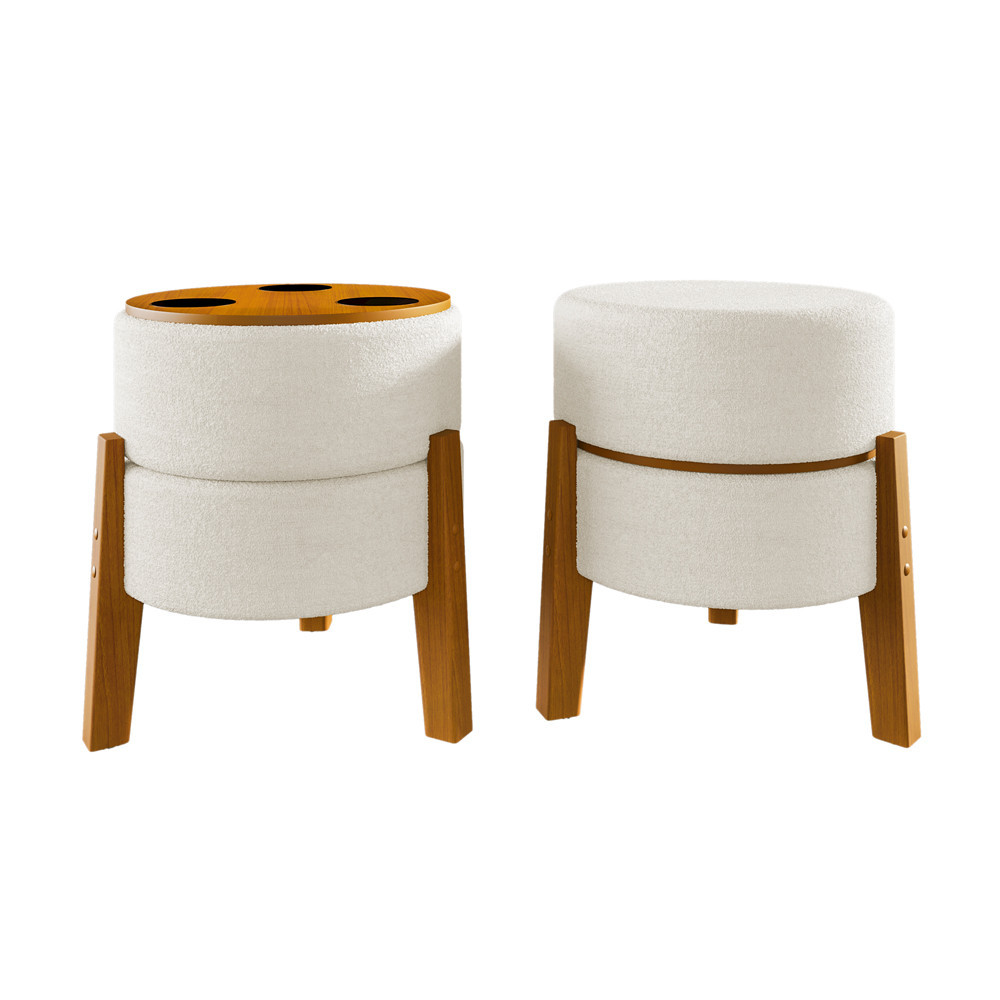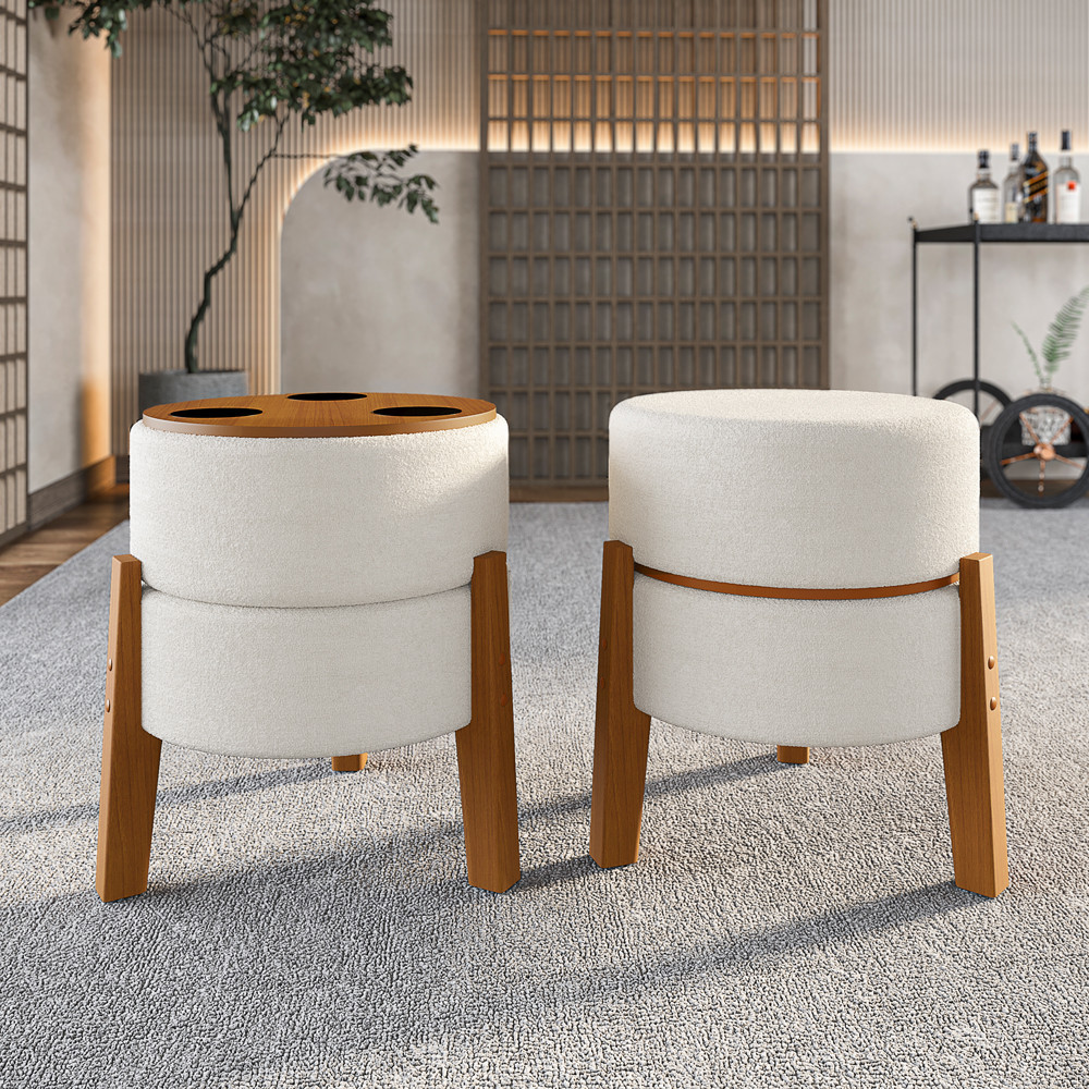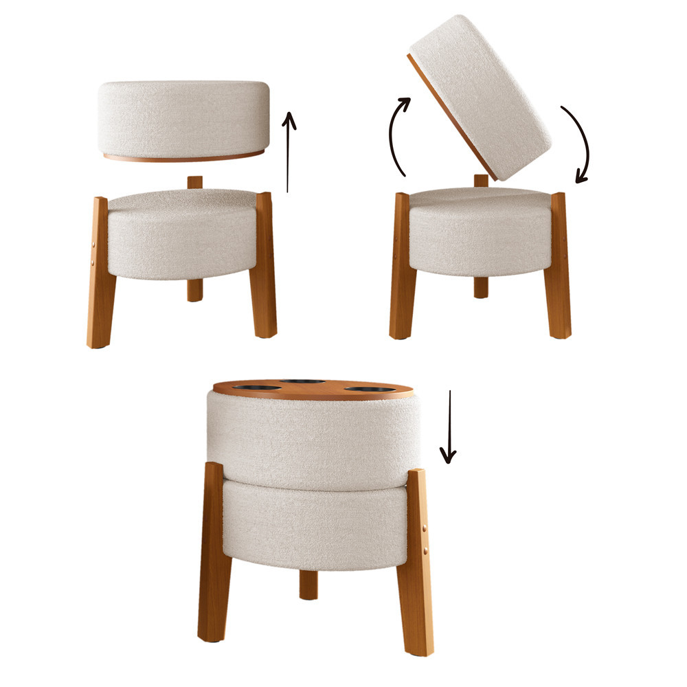 Puff Porta/copos Tecido Bouclê Pés De Madeira Maciça