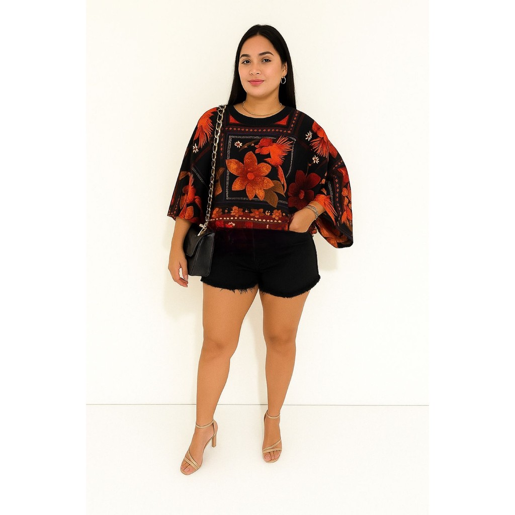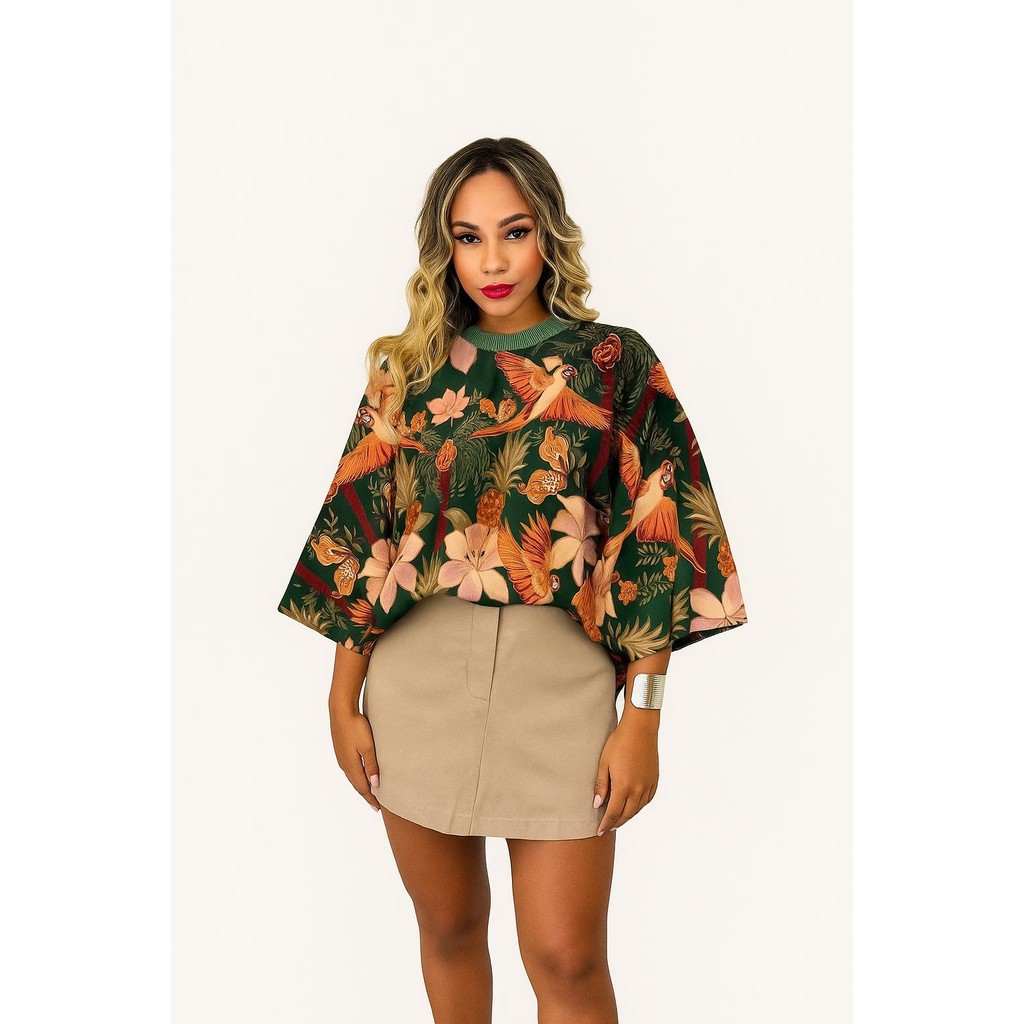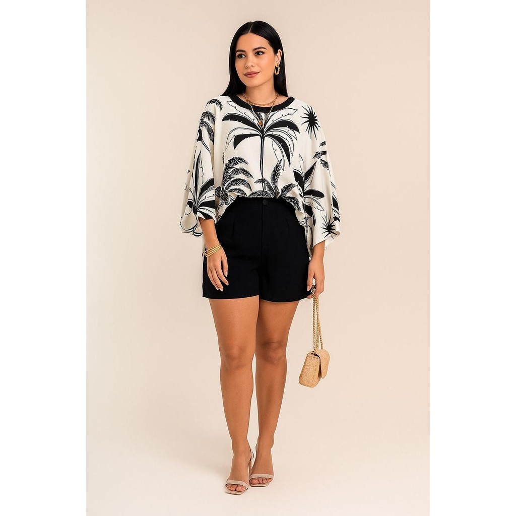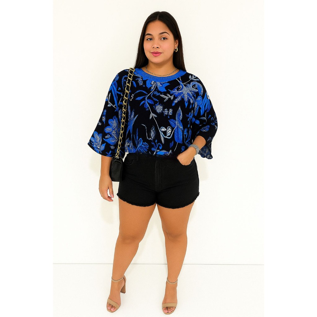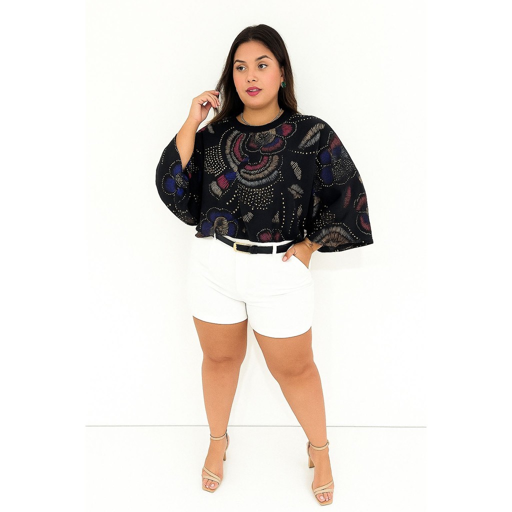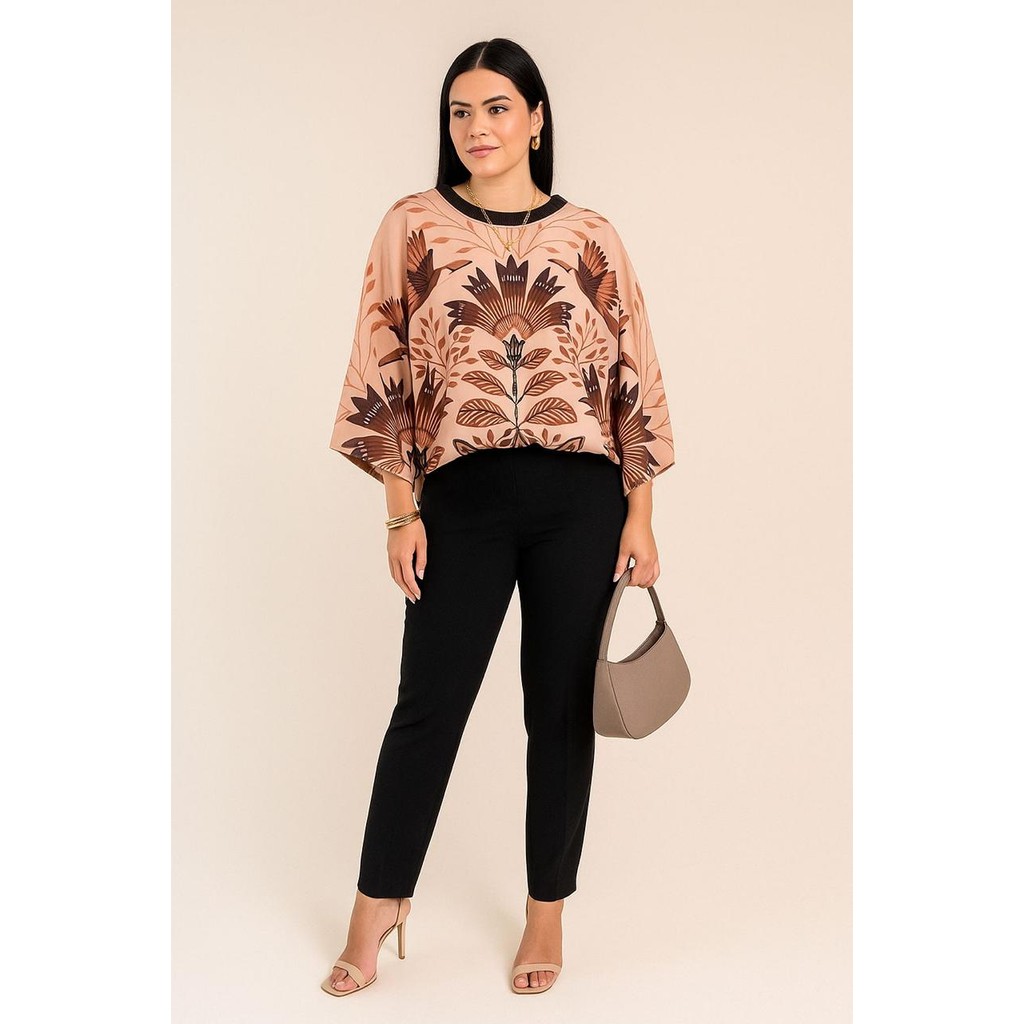 Blusa Feminina Estampada Elegante Inspiração Plus Size - T Shirt Manga Morcego 3/4