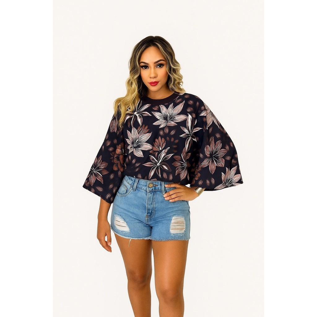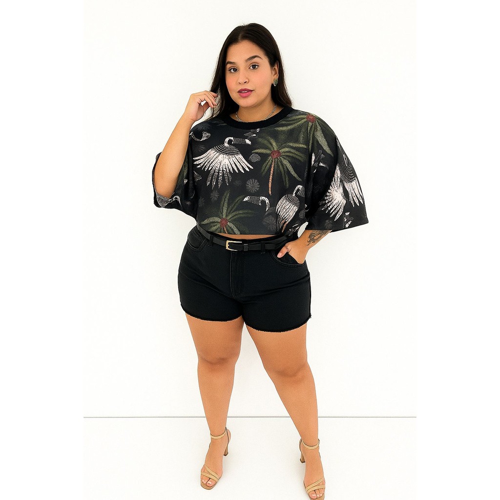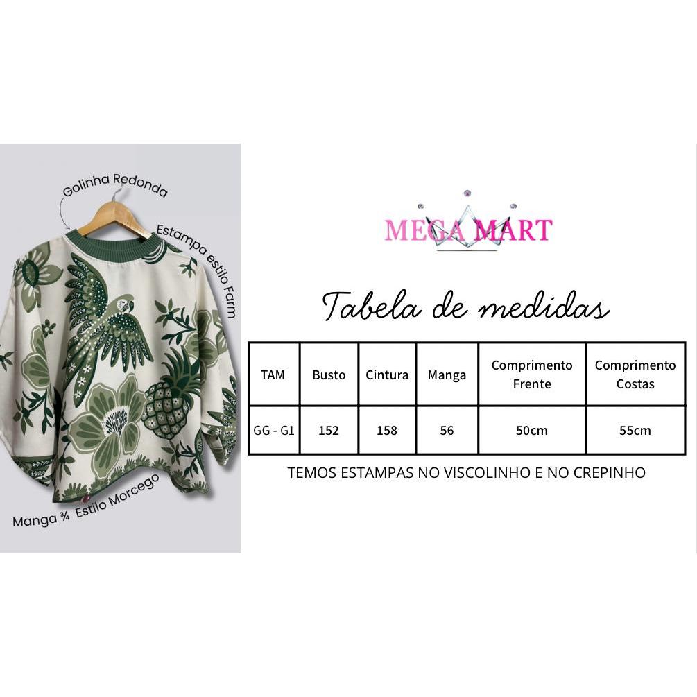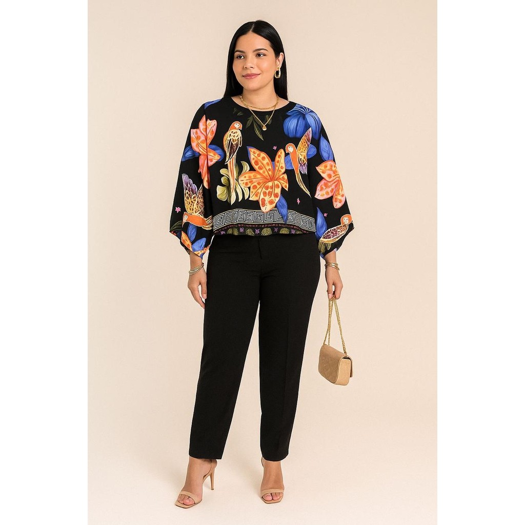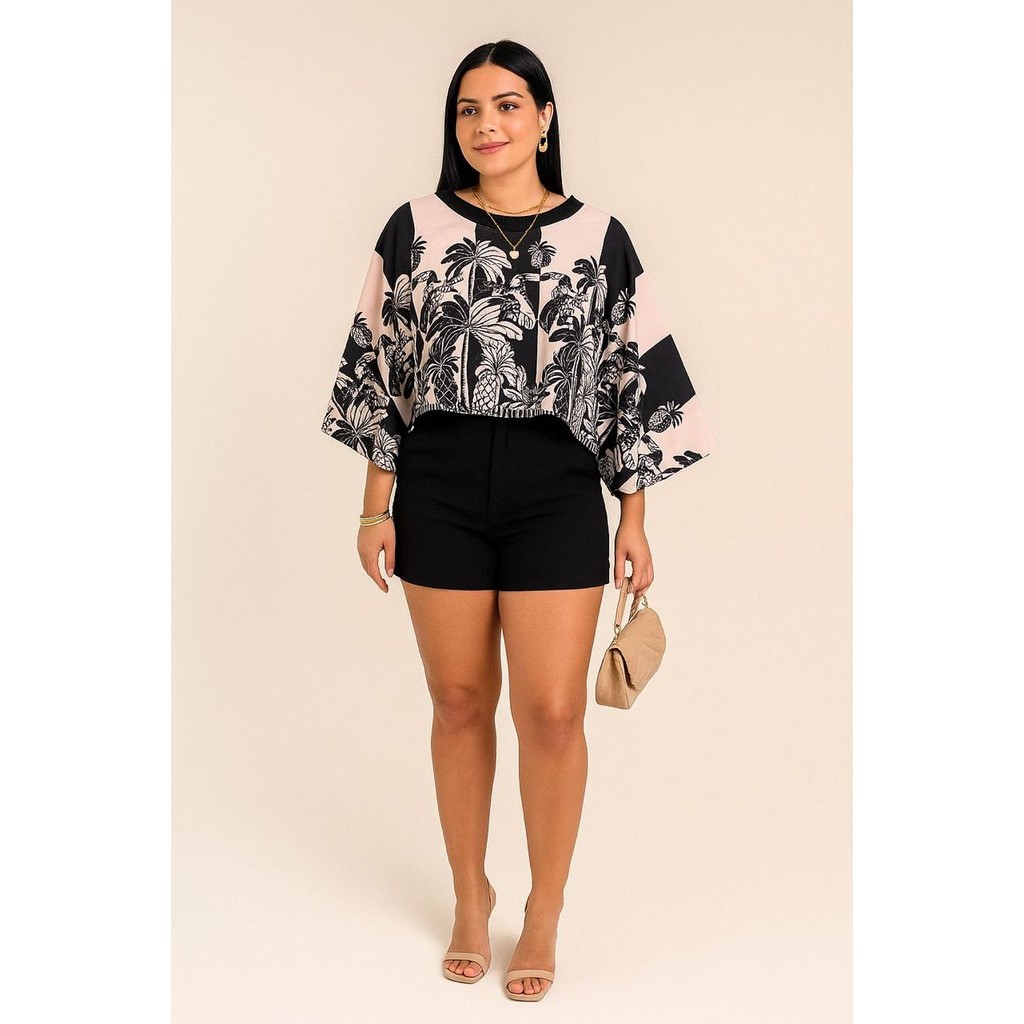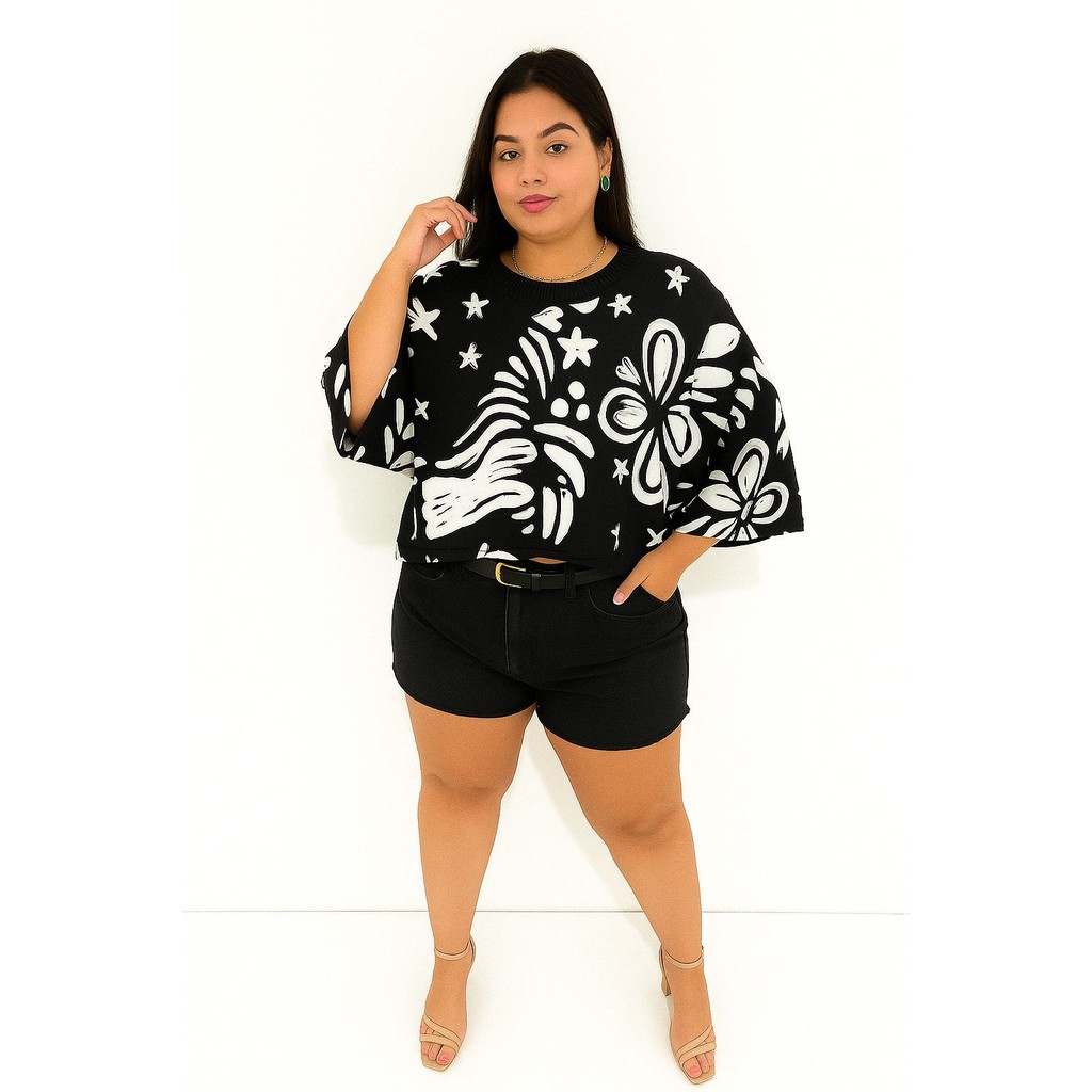 Blusa Feminina Estampada Elegante Inspiração Plus Size - T Shirt Manga Morcego 3/4