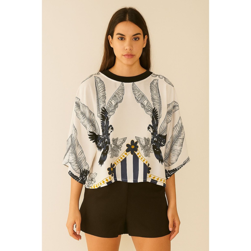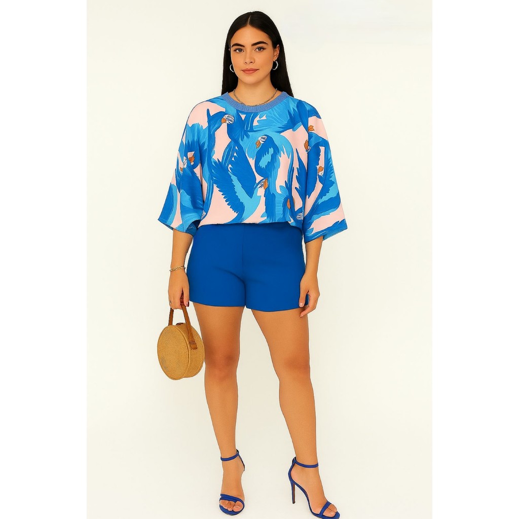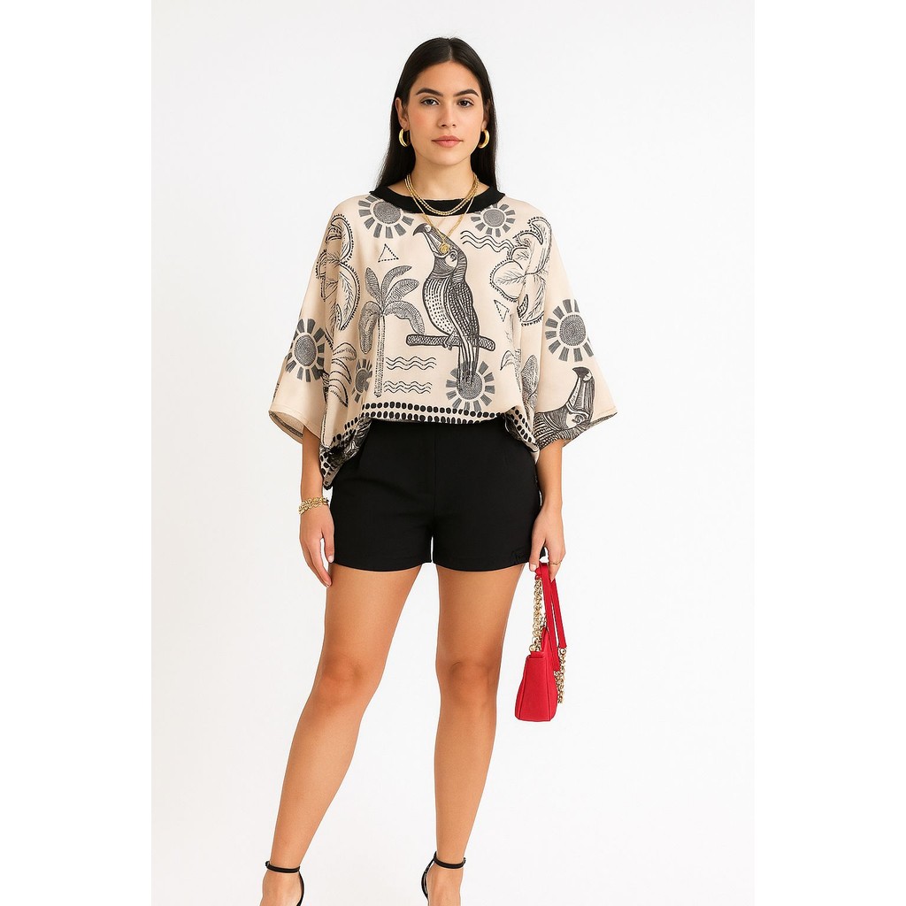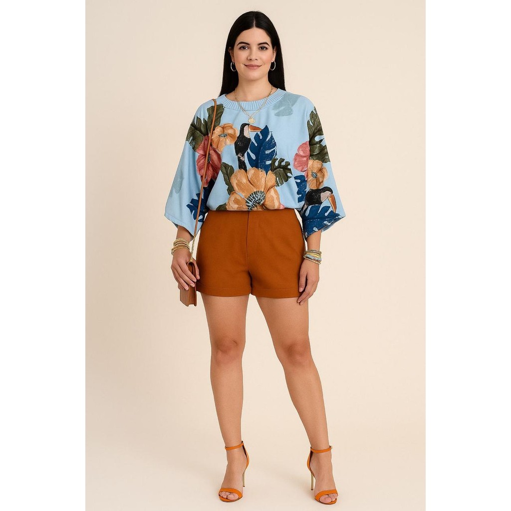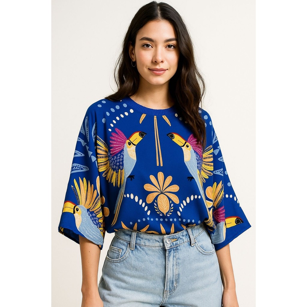 Blusa Feminina Estampada Elegante Inspiração Plus Size - T Shirt Manga Morcego 3/4
