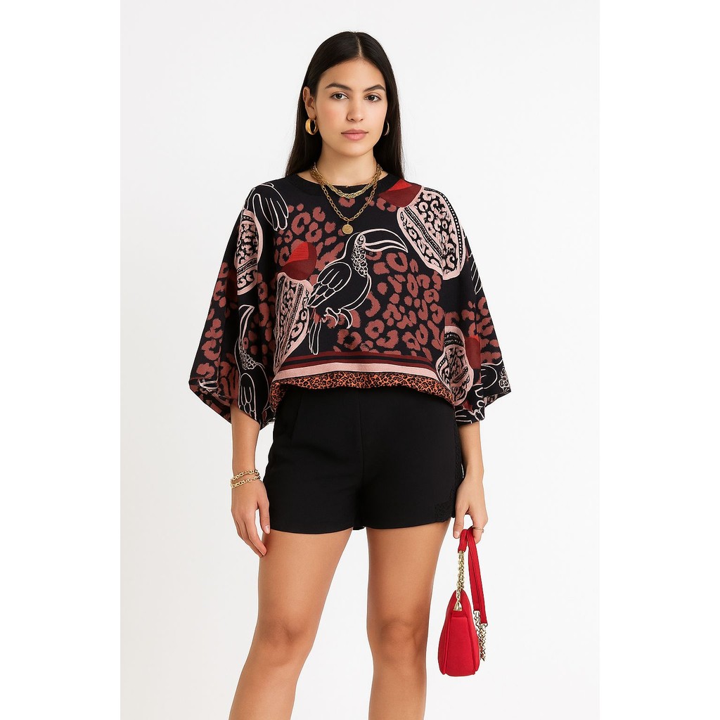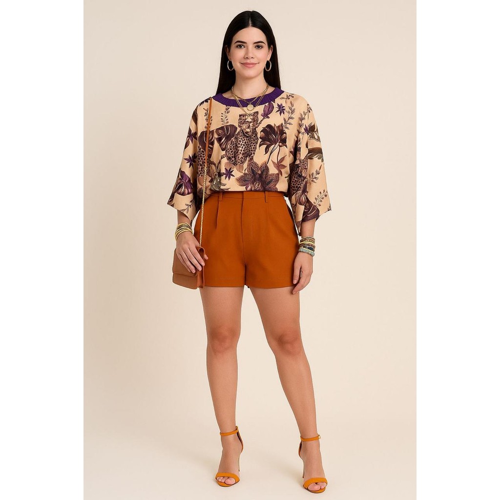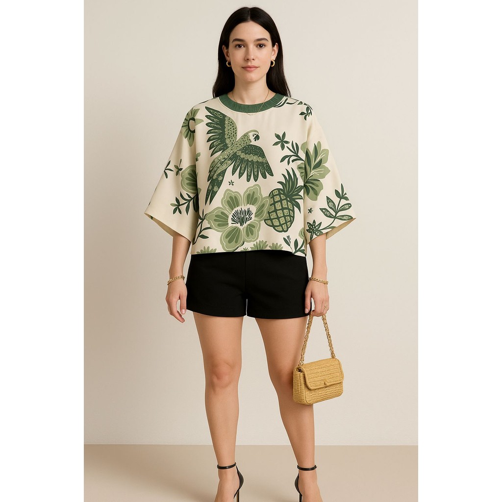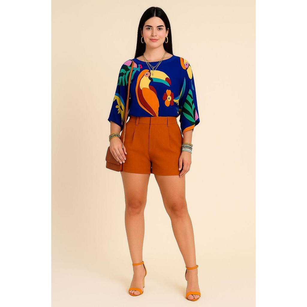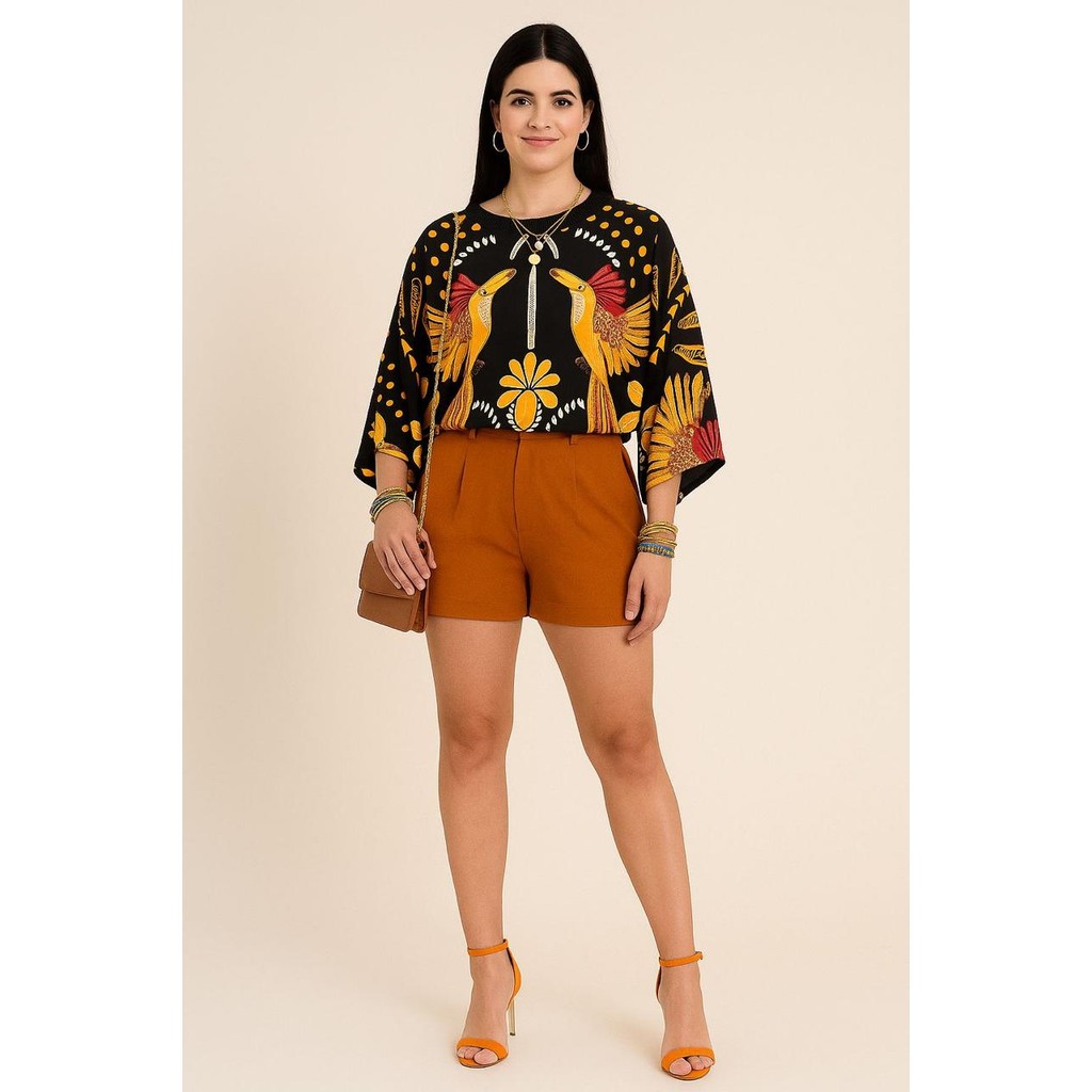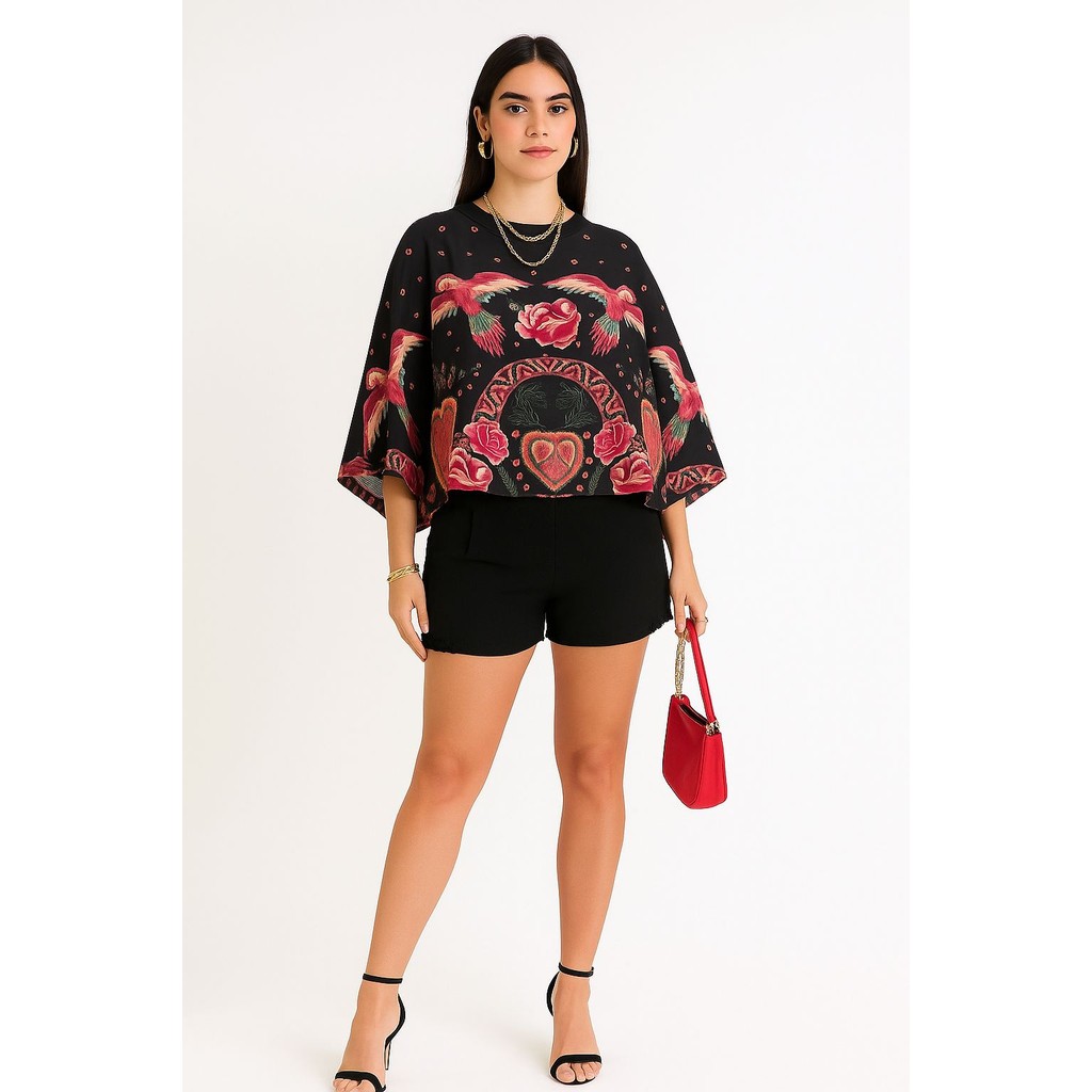 Blusa Feminina Estampada Elegante Inspiração Plus Size - T Shirt Manga Morcego 3/4