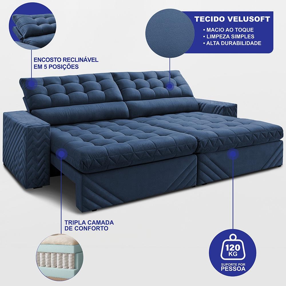 Sofá Retrátil e Reclinável 2,30m Molas Ensacadas Max Spring Velusoft Azul Cama inBox