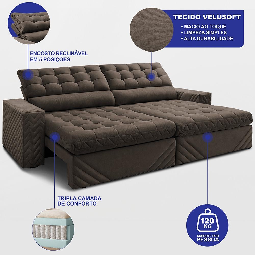 Sofá Retrátil e Reclinável 2,50m Molas Ensacadas Max Spring Velusoft Café Cama inBox
