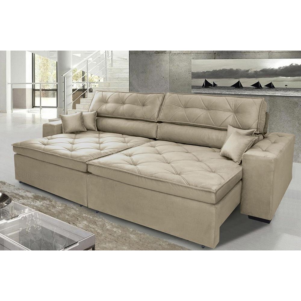 Sofá Austin 3,02m Retrátil, Reclinável com Molas no Assento e Almofadas, Suede Bege Cama inBox