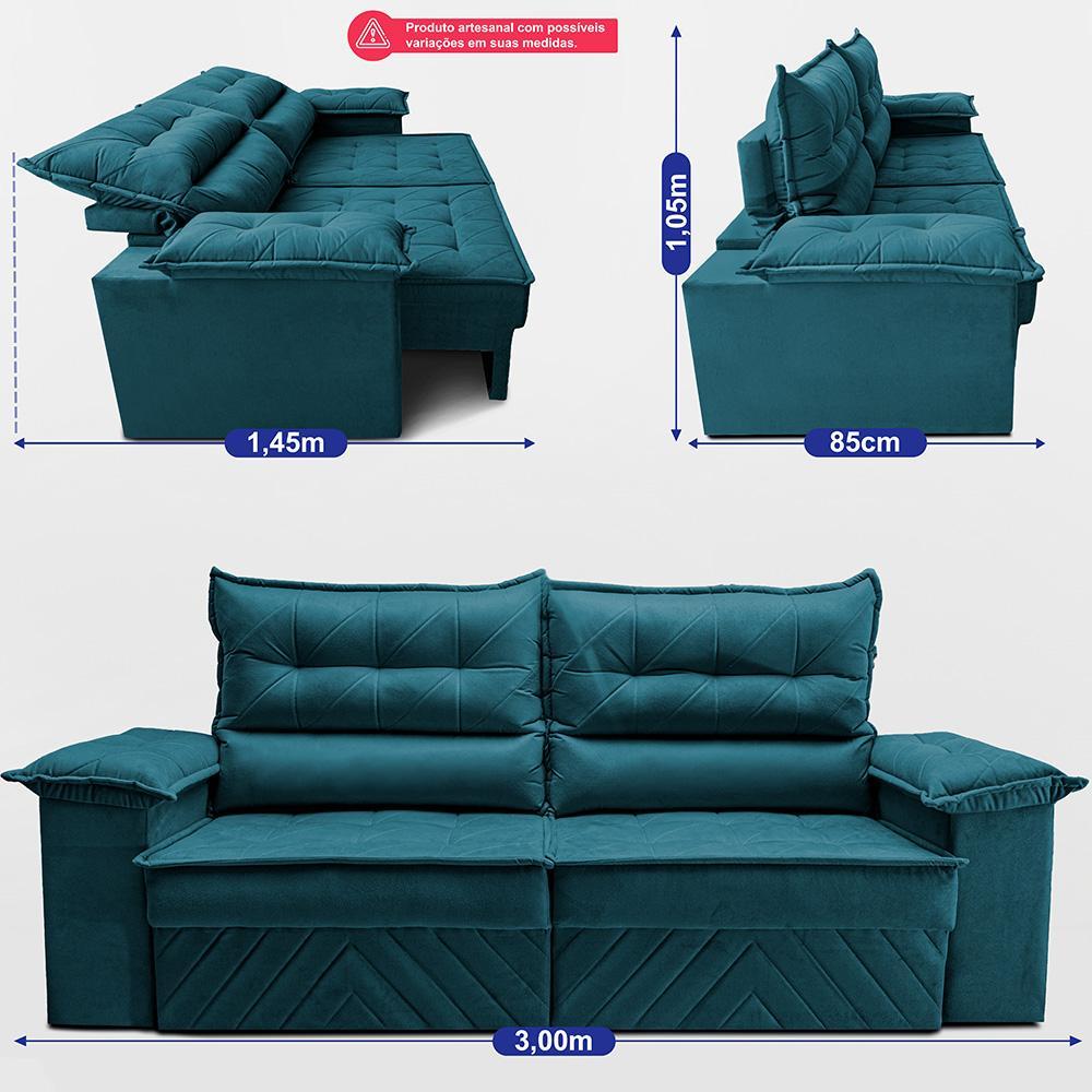 Sofá Retrátil e Reclinável 3,00m com Molas e Espuma D33 Thunder Velusoft Petróleo Cama inBox