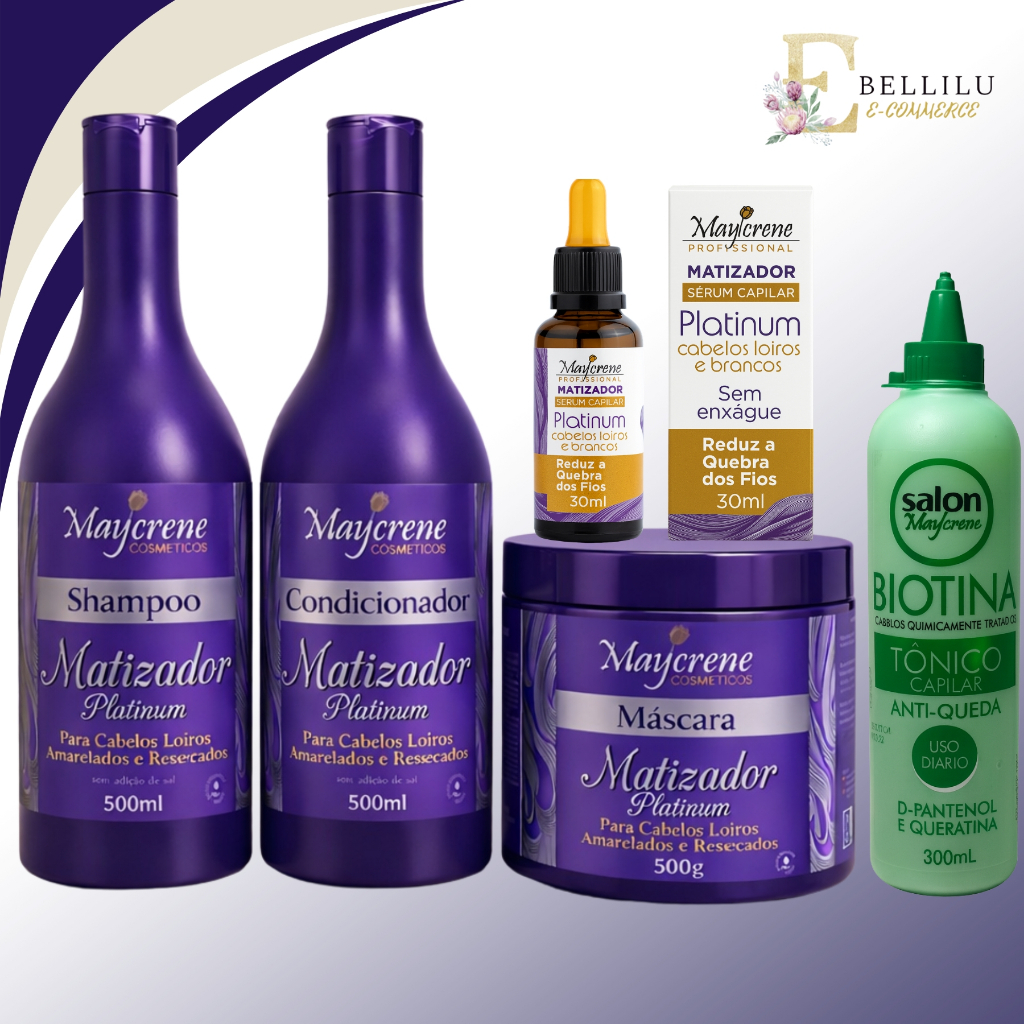 Kit Matizador Platinum Maycrene + Sérum Matizador + Tonico biotina 300g Fortalecimento e Nutrição