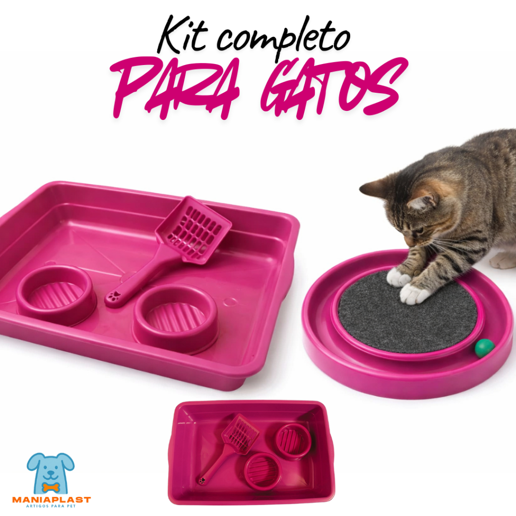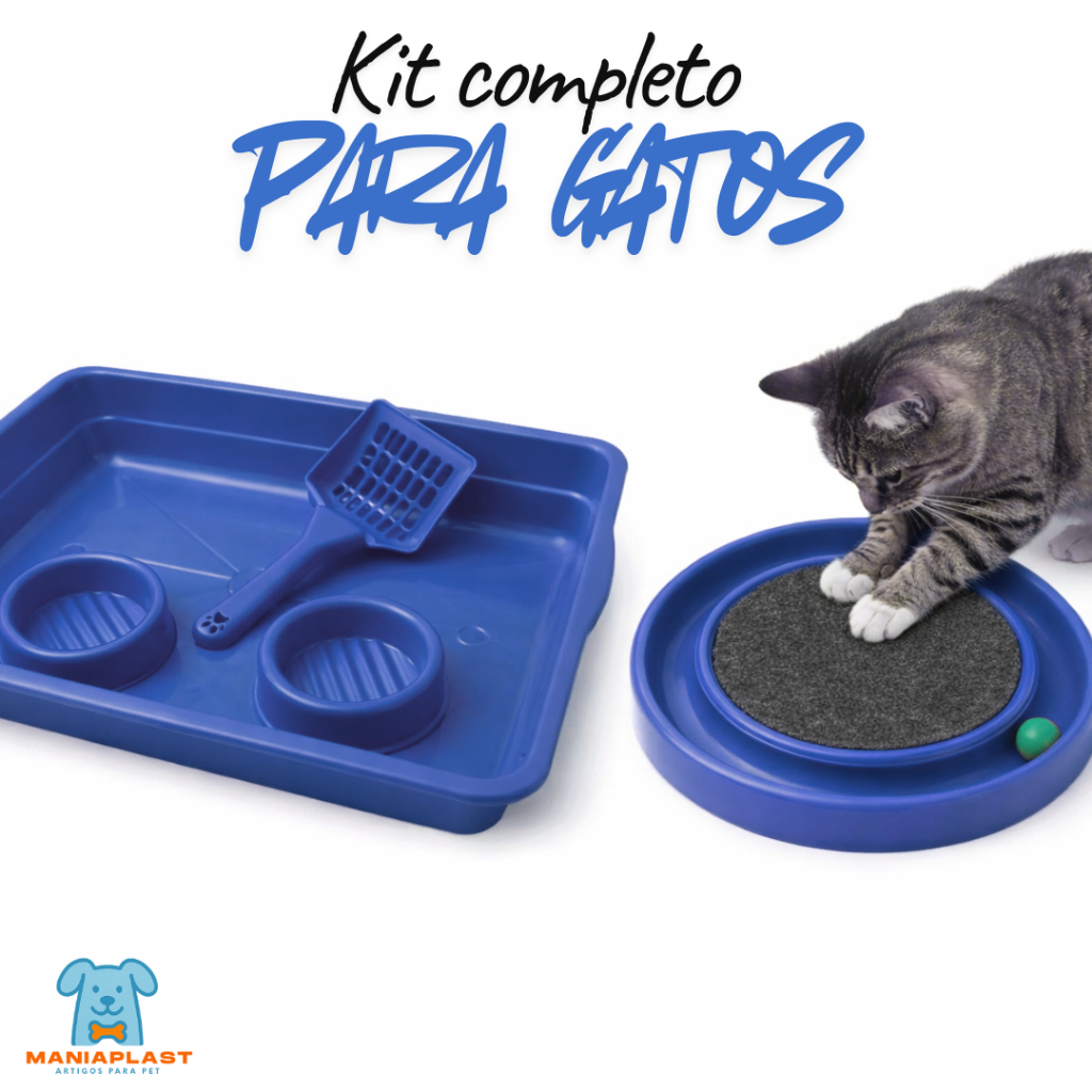Kit Caixa de Areia para Gatos Bandeja e Peneira e Comedouros + Arranhador Redondo Interativo com Bolinha