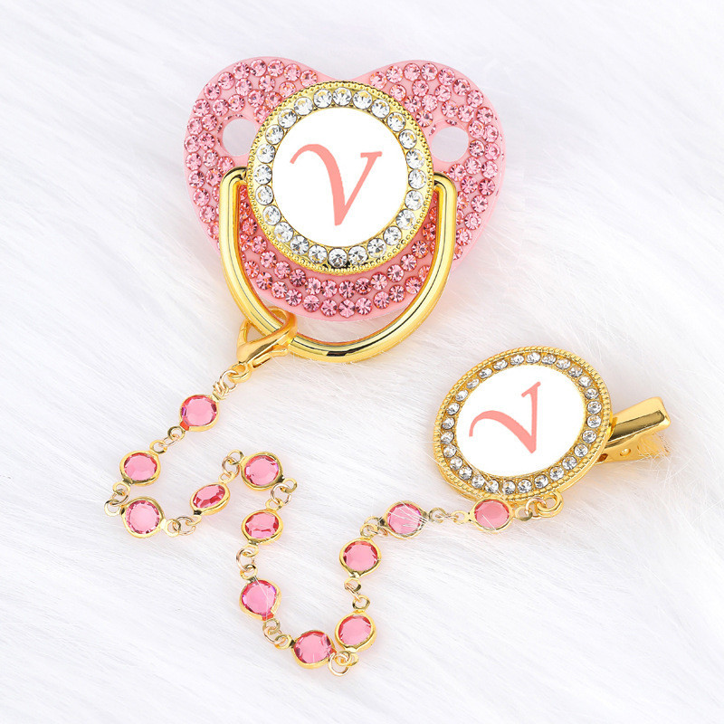 26 Cartas Iniciais Pink/Blue Baby Pacifier Com Clipe De Corrente De Diamante