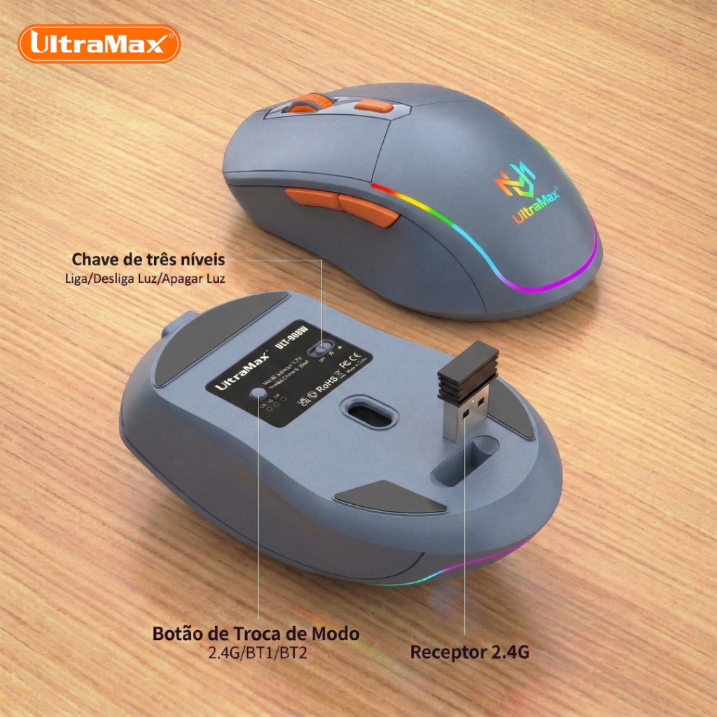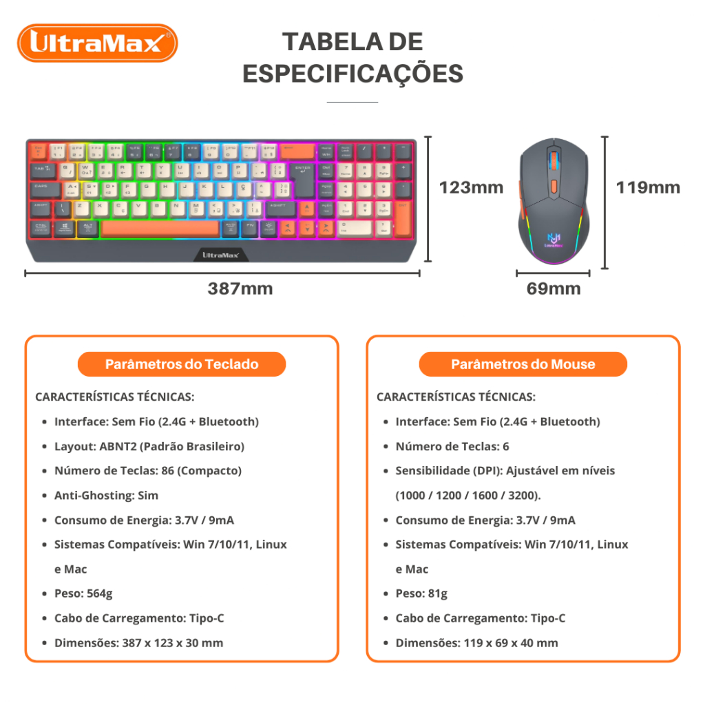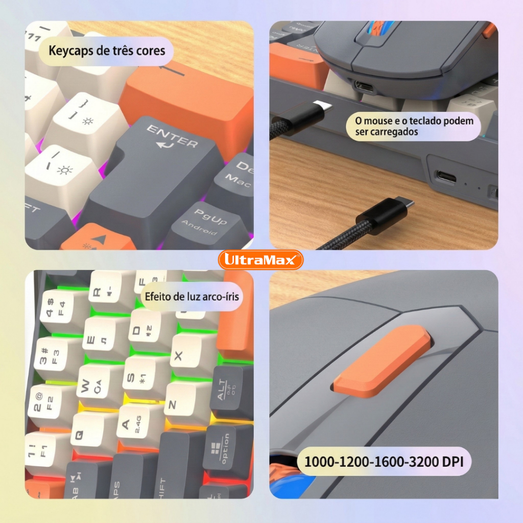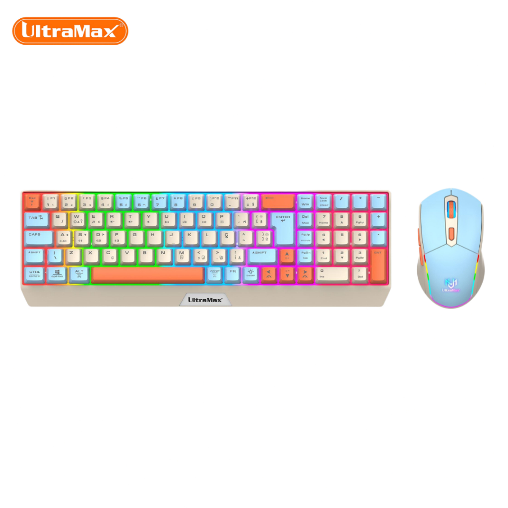 Kit Teclado e Mouse Sem Fio Gamer UltraMax ULT-908W Bluetooth + 2.4GHz RGB Recarregável ABNT2.