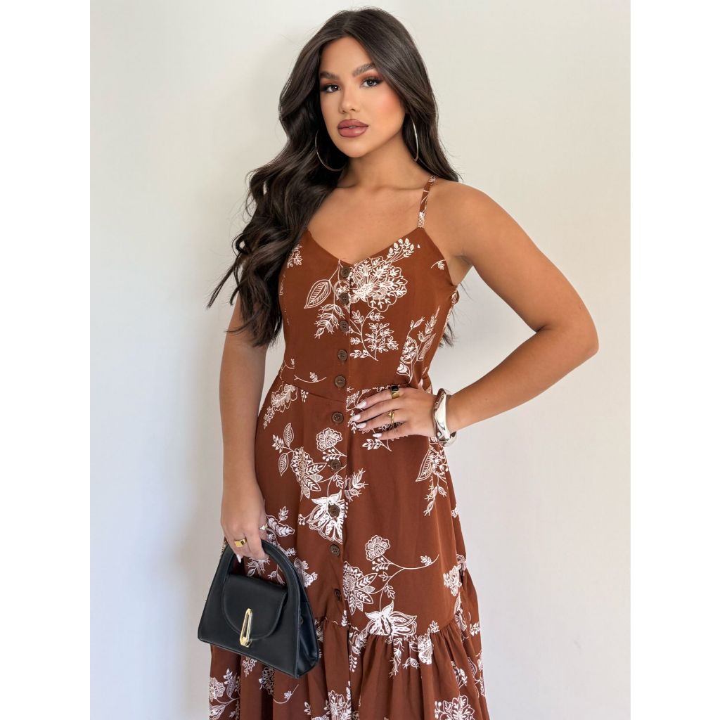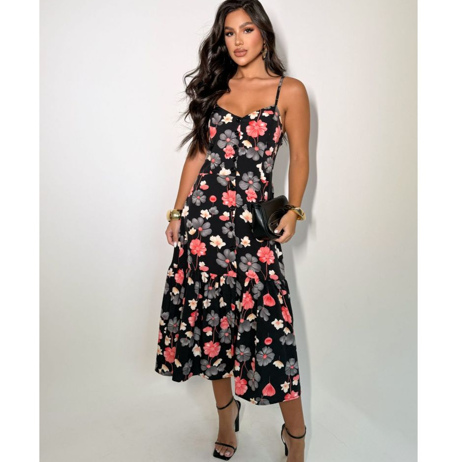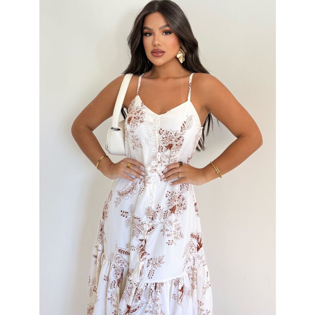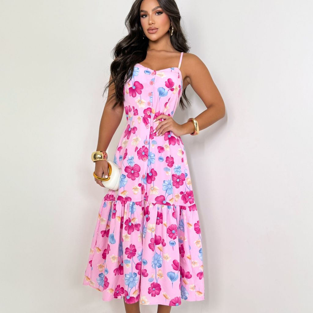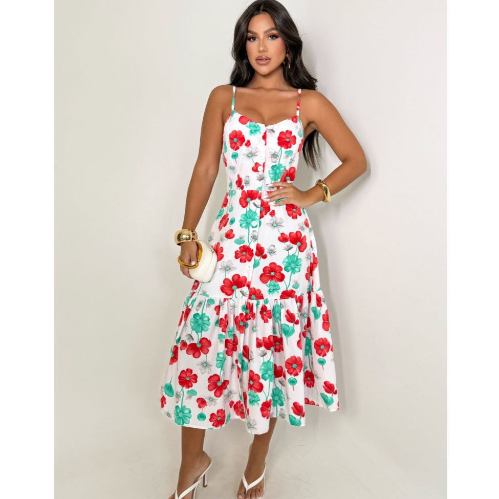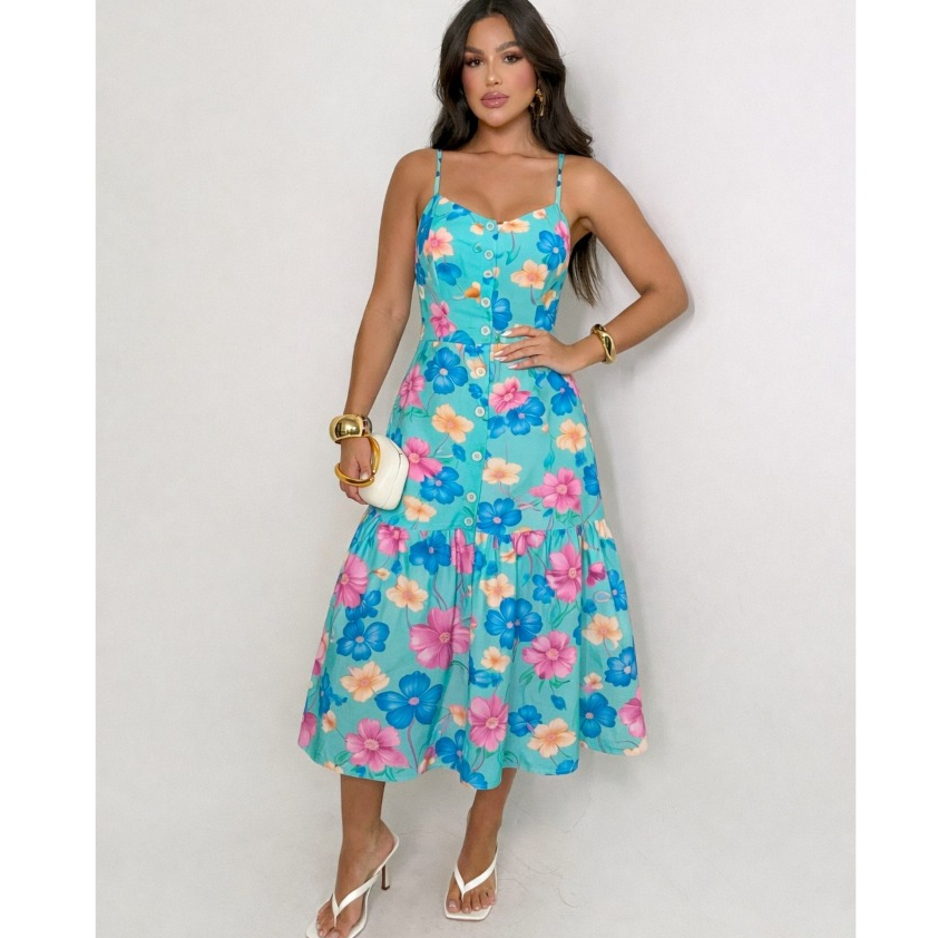Vestido Mídi Floral Alça Fina Verão Casual Elegante 2026