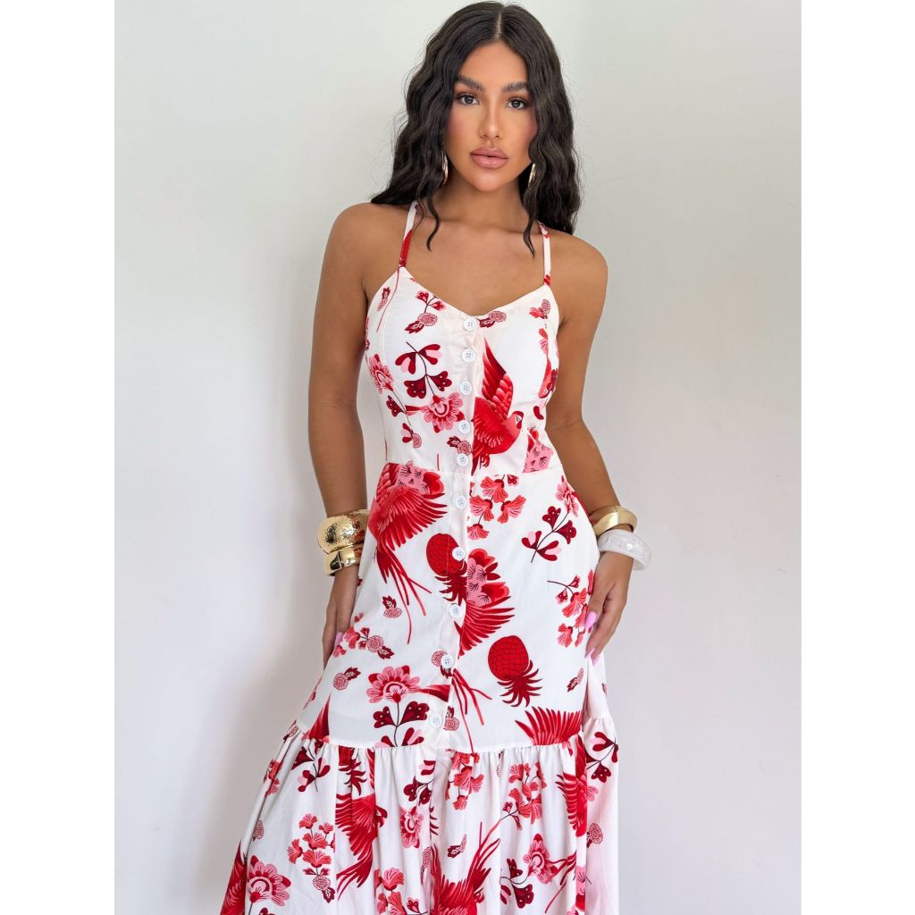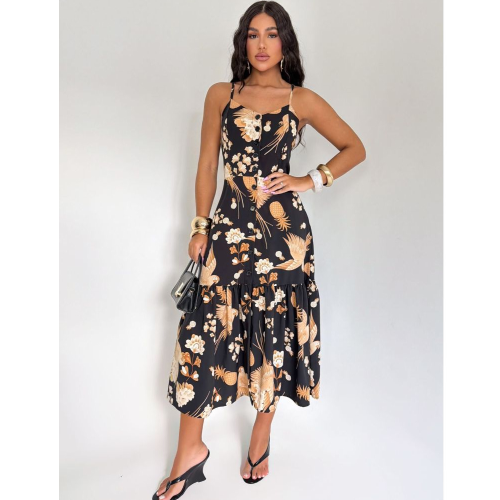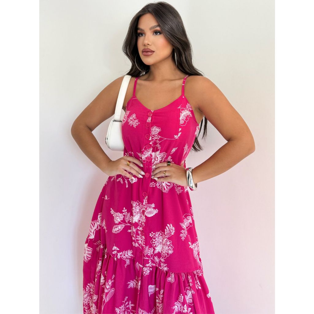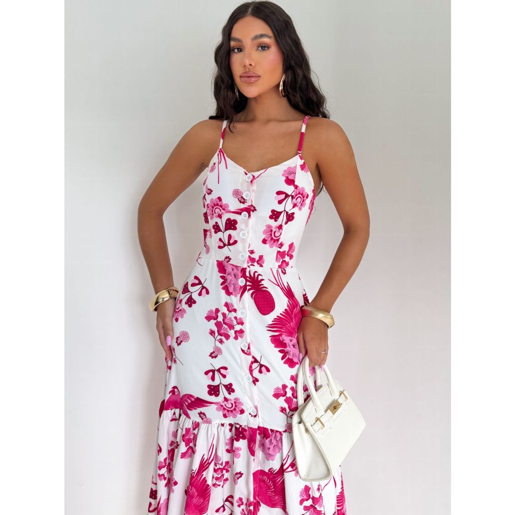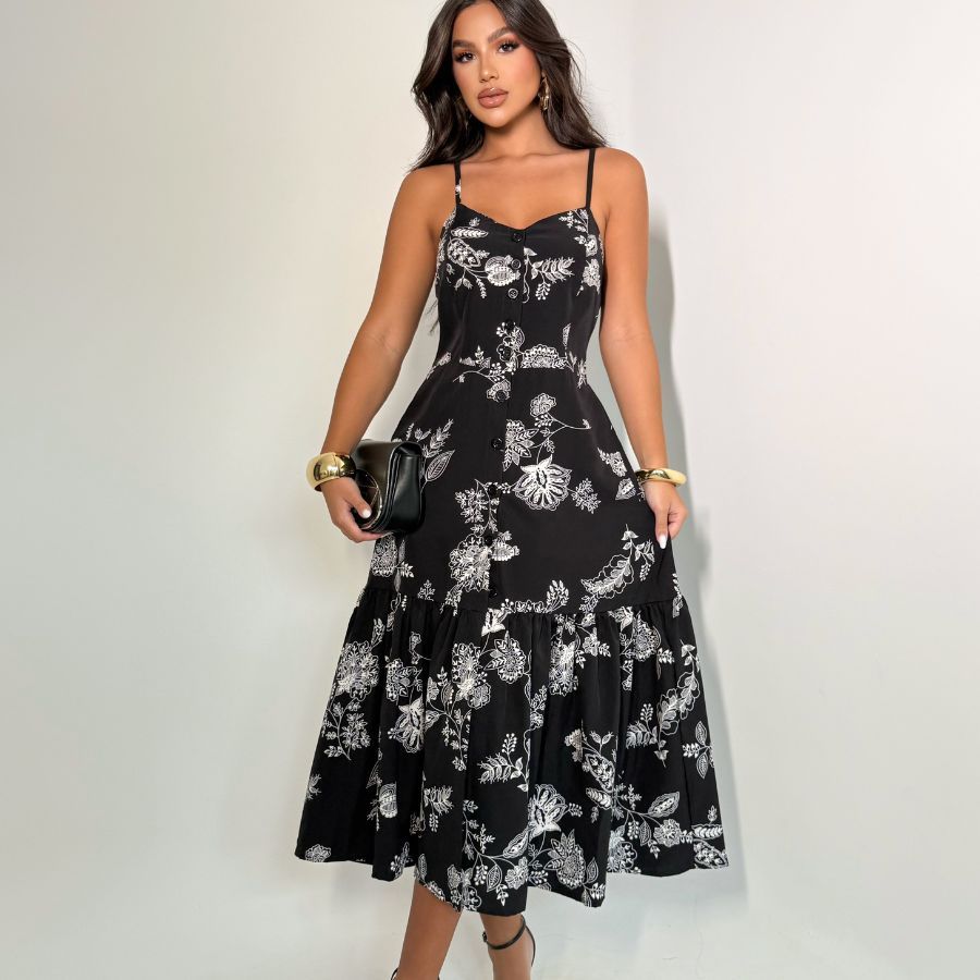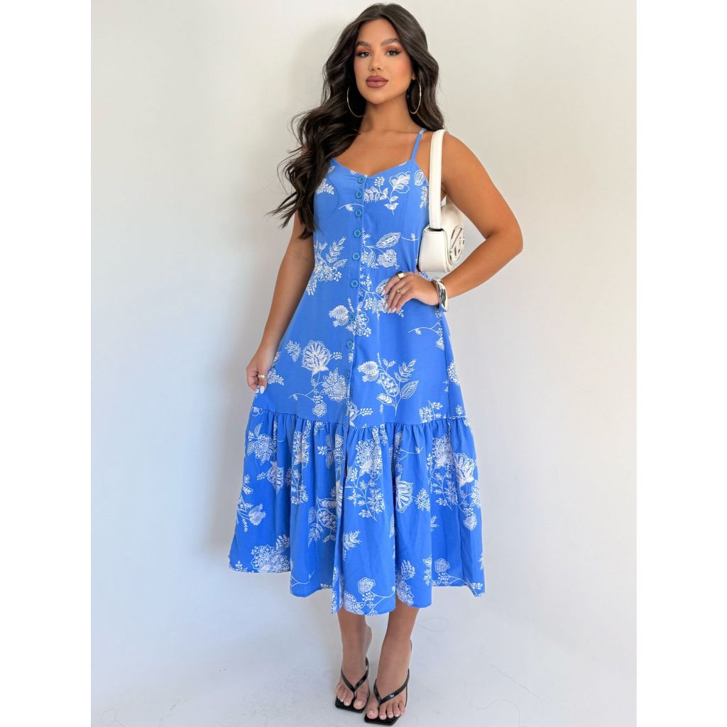 Vestido Mídi Floral Alça Fina Verão Casual Elegante 2026