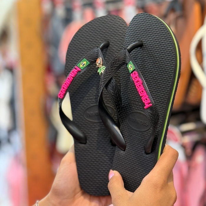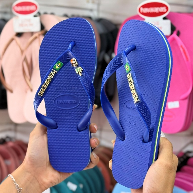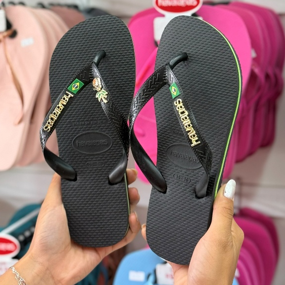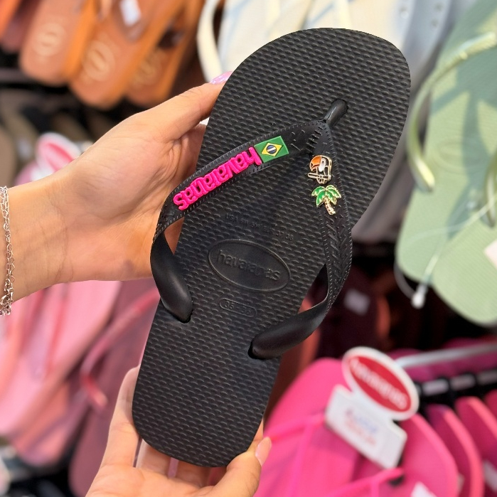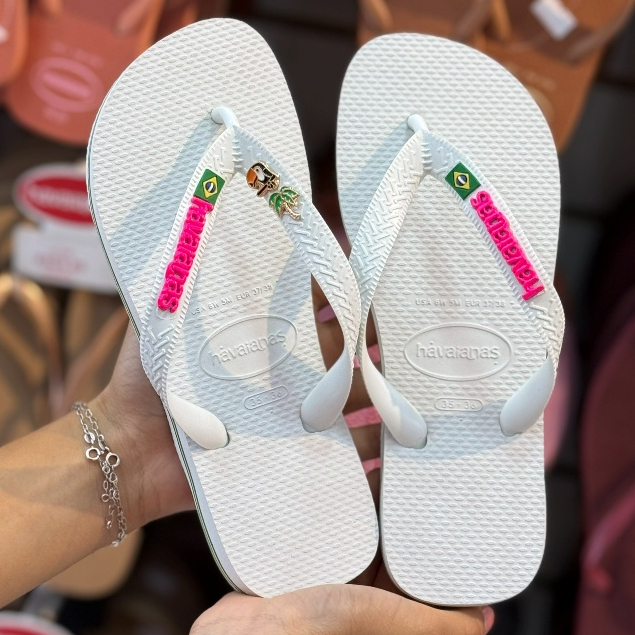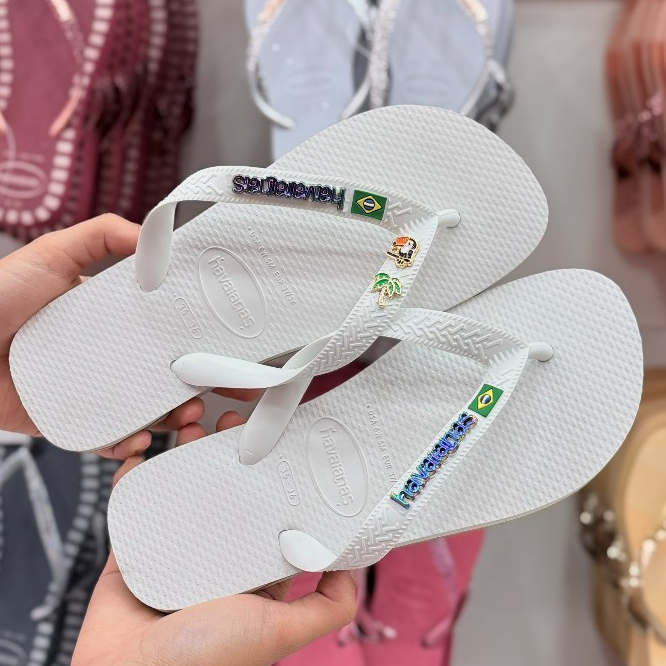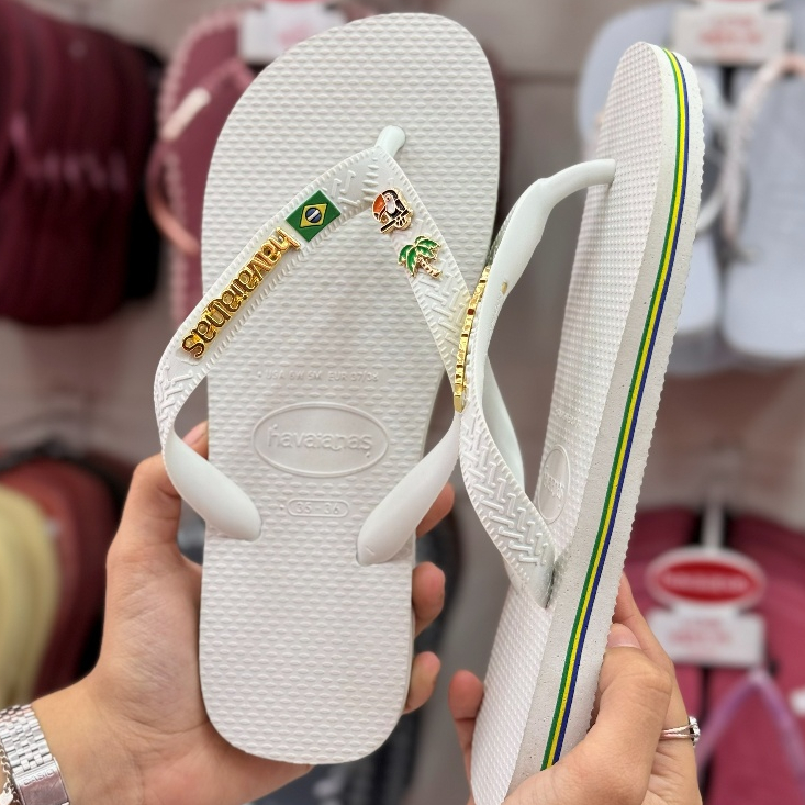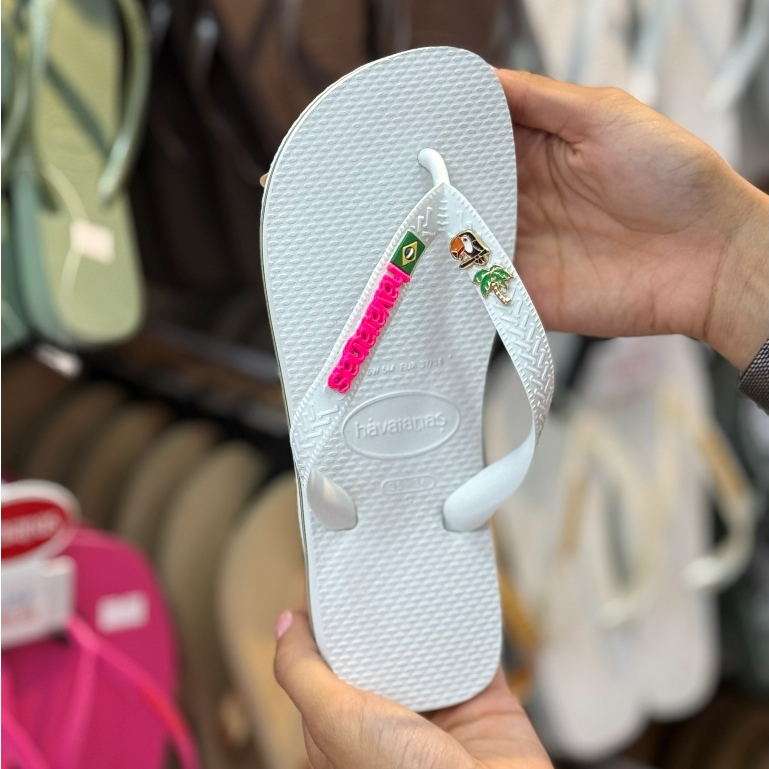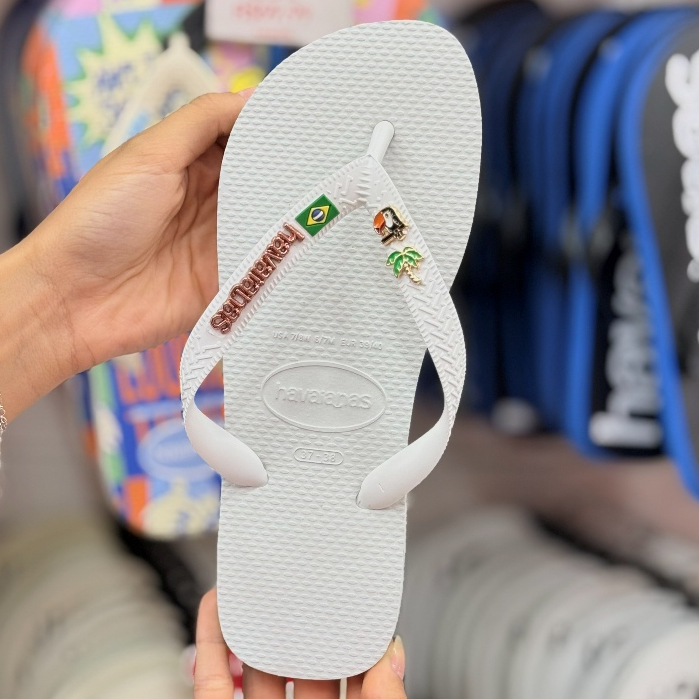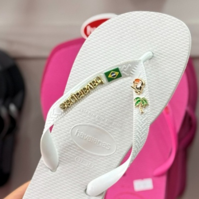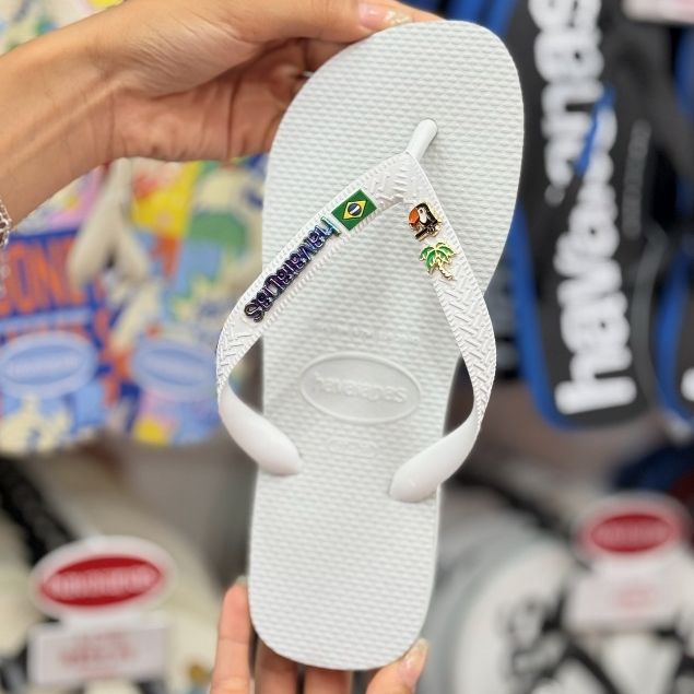 Chinelo Havaianas Brasil com Placa Logo e Pingente Tucano e Coqueiro Modelo Tradicional Branco
