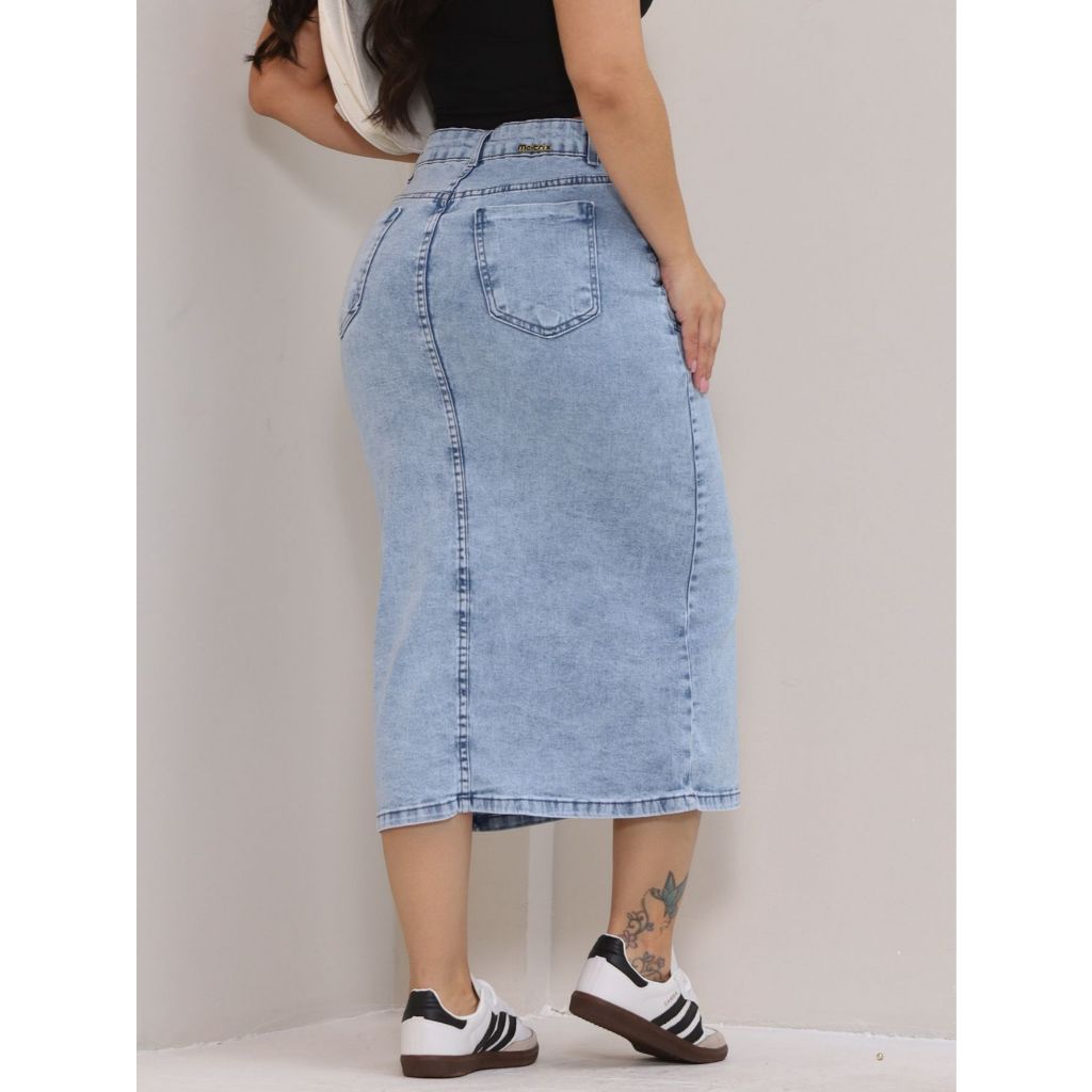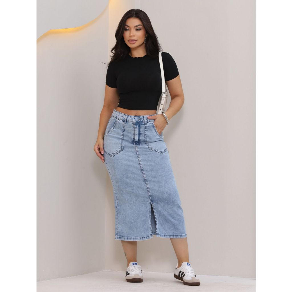Saia Midi Jeans Com Fenda Na Frente Com Lycra Moda Evangélica Modesta