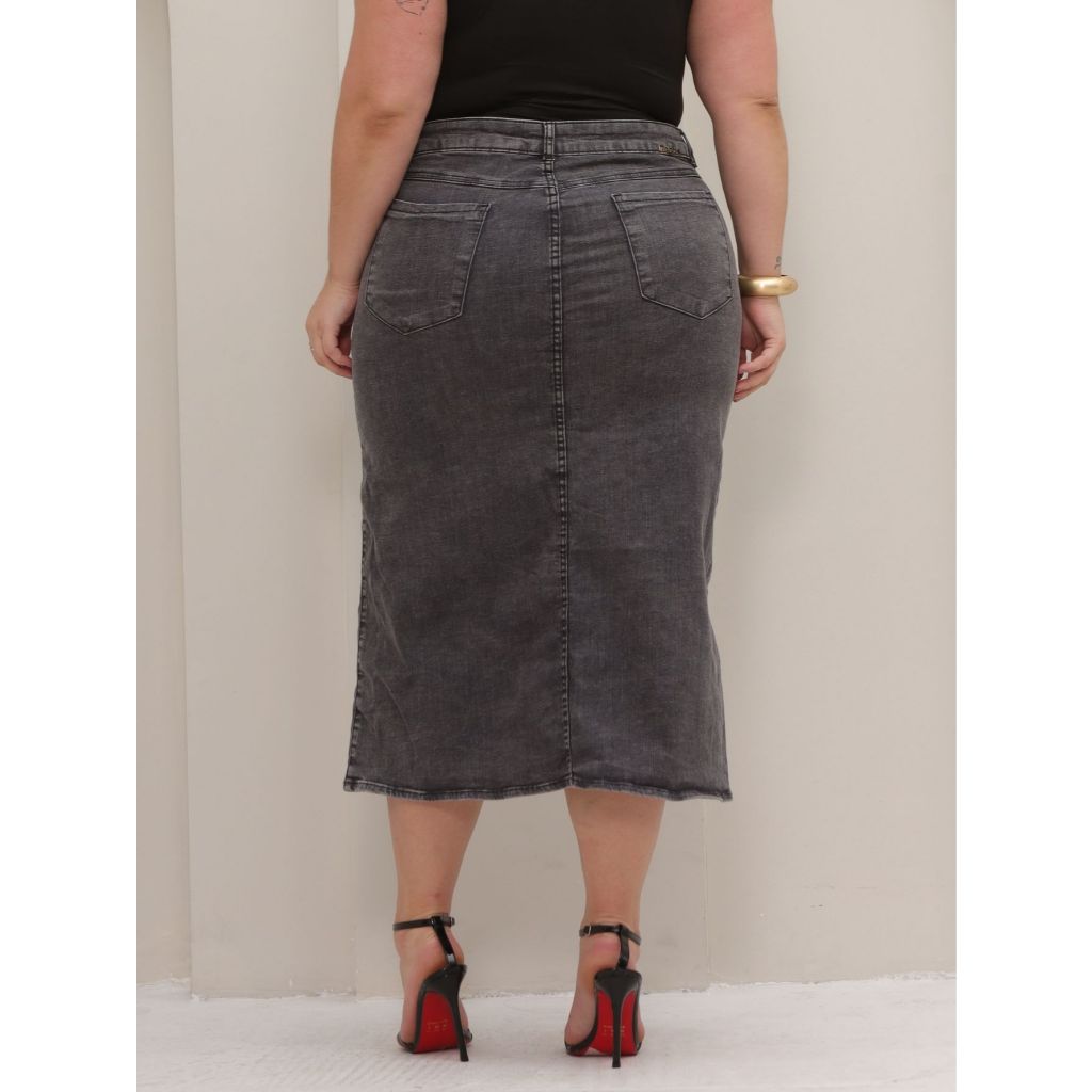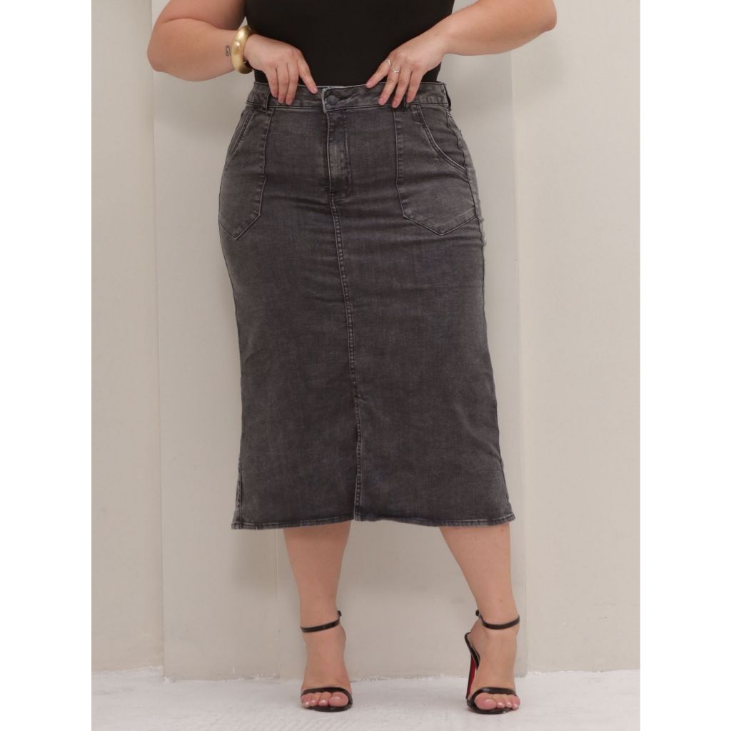 Saia Midi Jeans Com Fenda Plus Size Com Lycra Modesta Culto