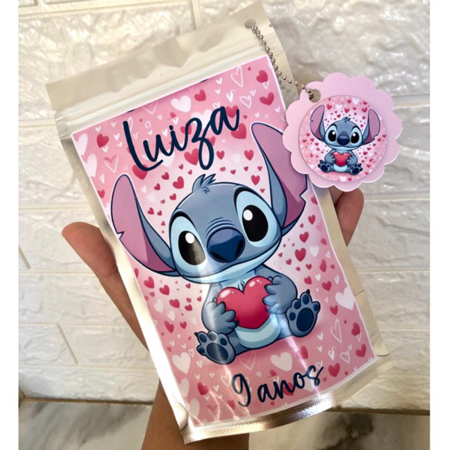 Saquinhos Metalizados Stitch com Corações - Lembrancinha