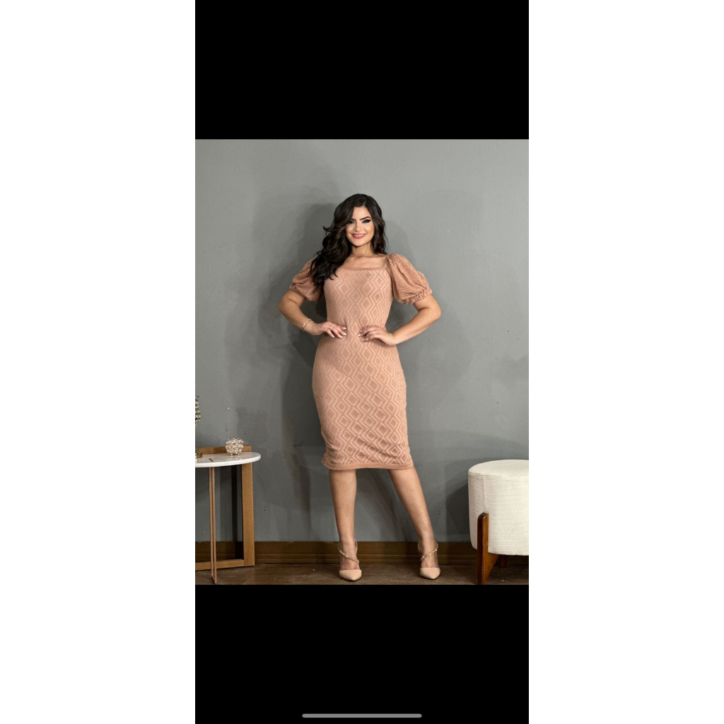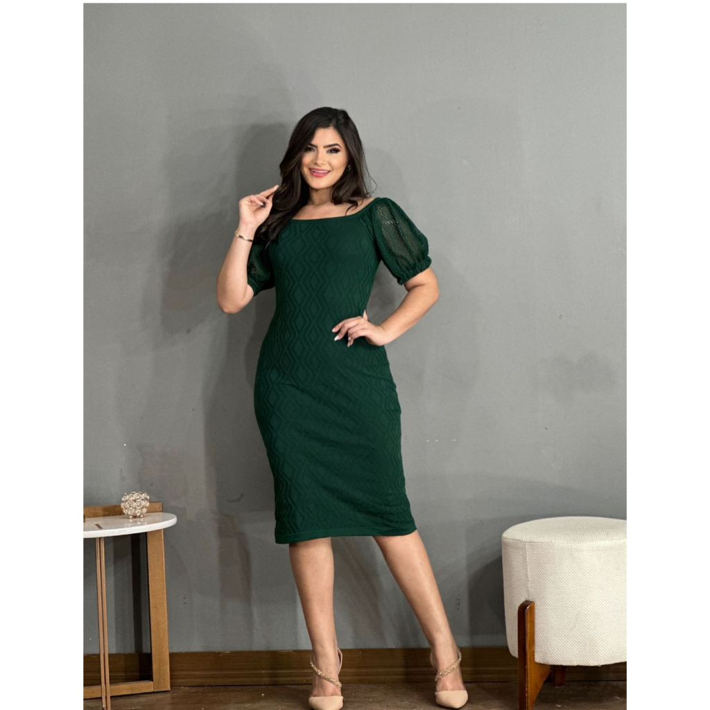 Vestido Midi Tricot Losango com Manga Detalhada Moda Evangélica