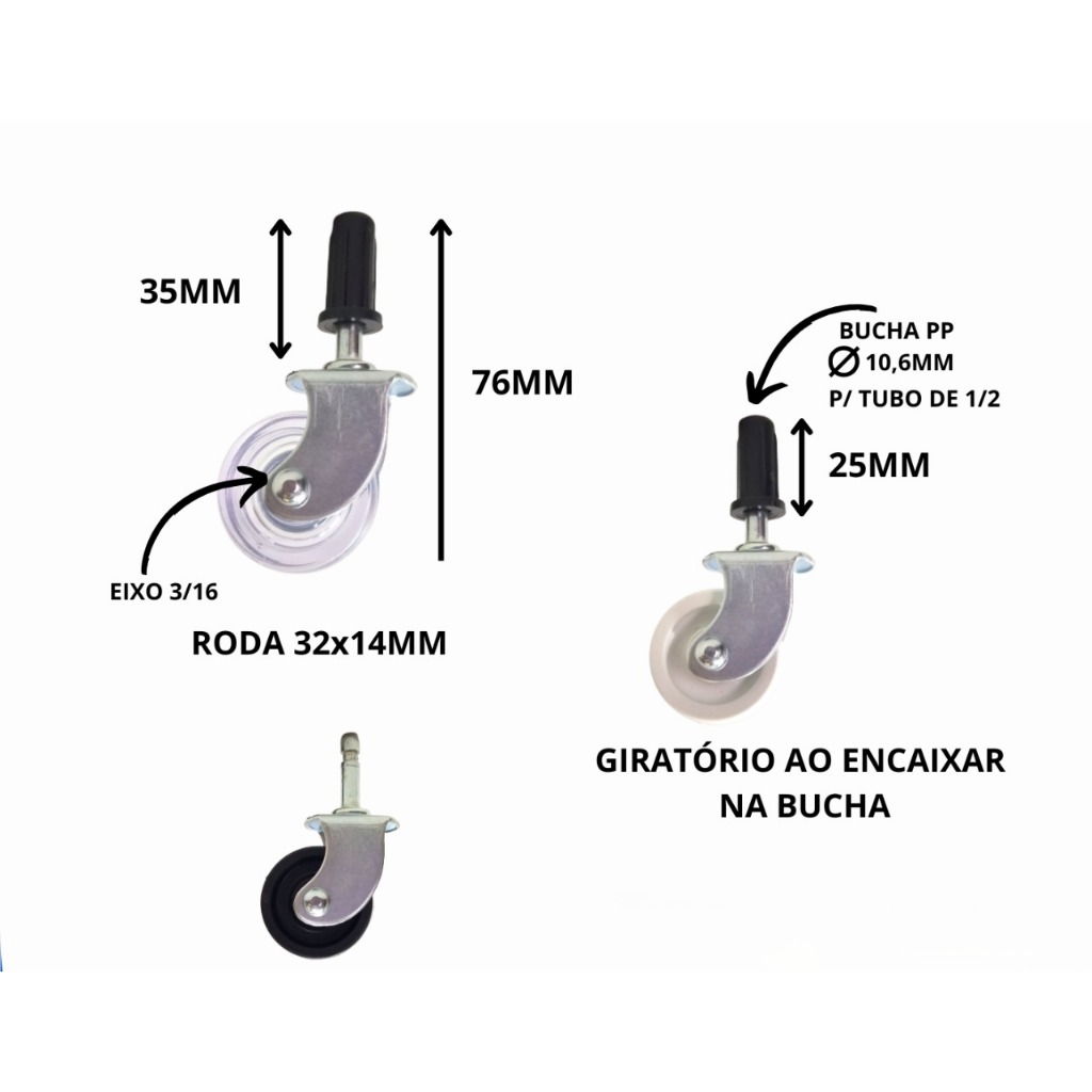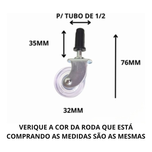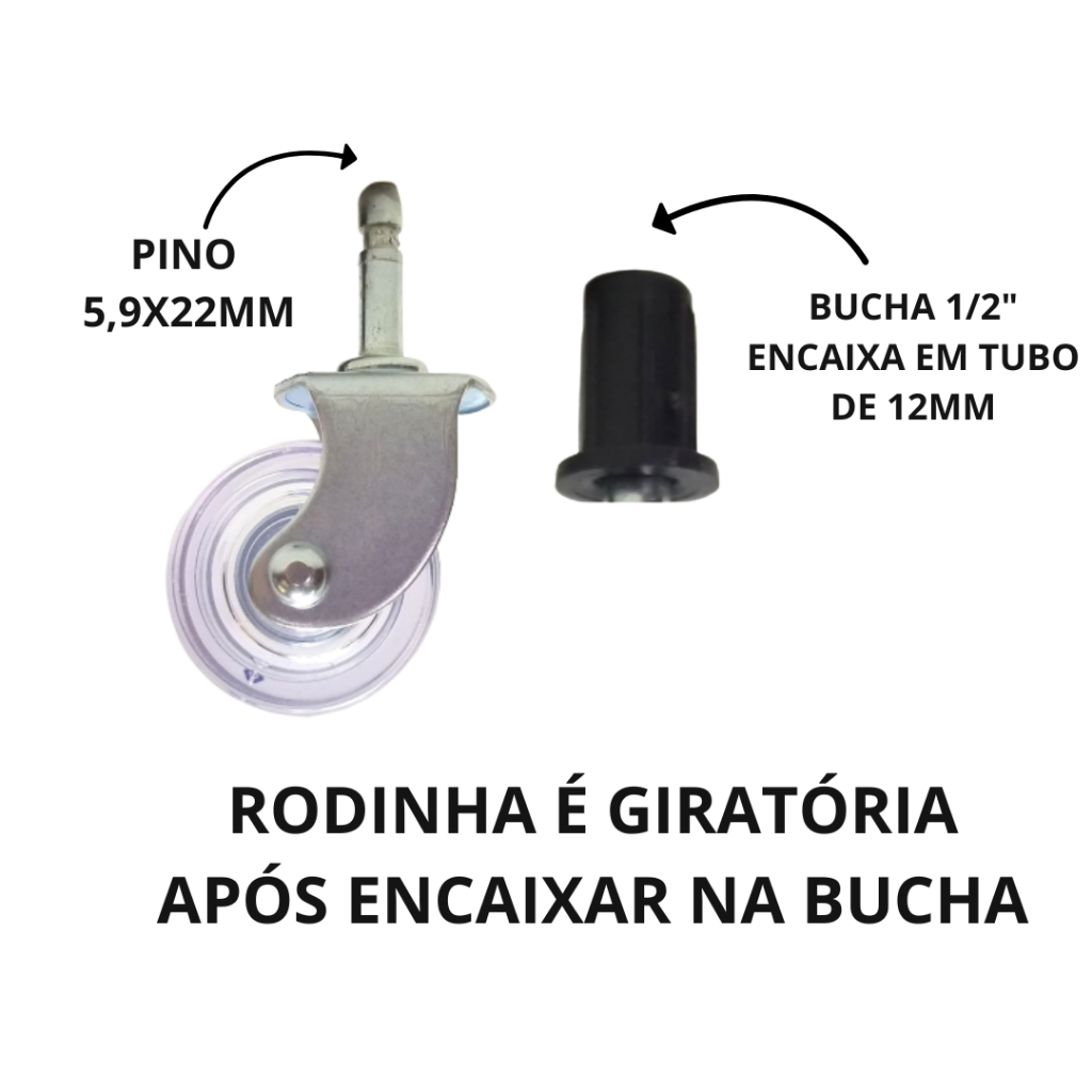 Kit 6 Rodízio Rodinha Pino e Bucha de 1/2 roda 4cm p/ suportes diversos Roda 114 cristal