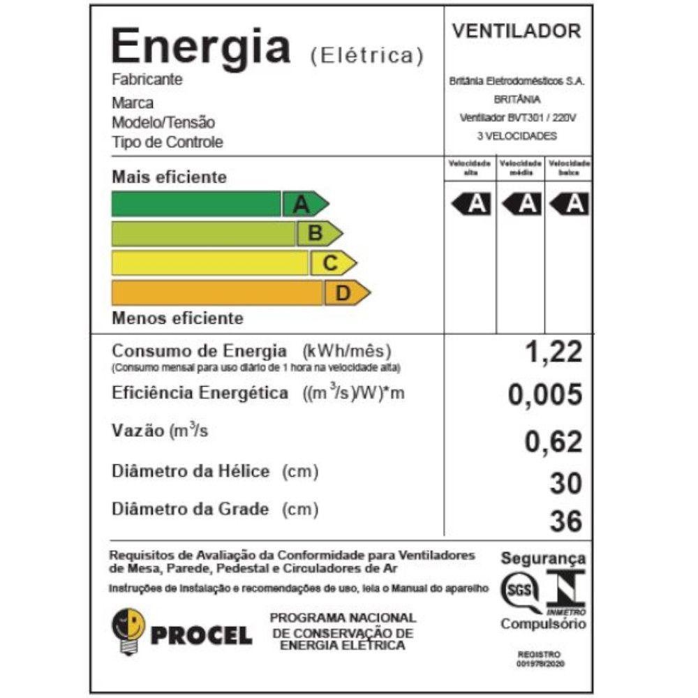 Ventilador De Mesa / Parede Britânia BVT301 Turbo 6 Pás 30cm Tecnologia Maxx Force 60W