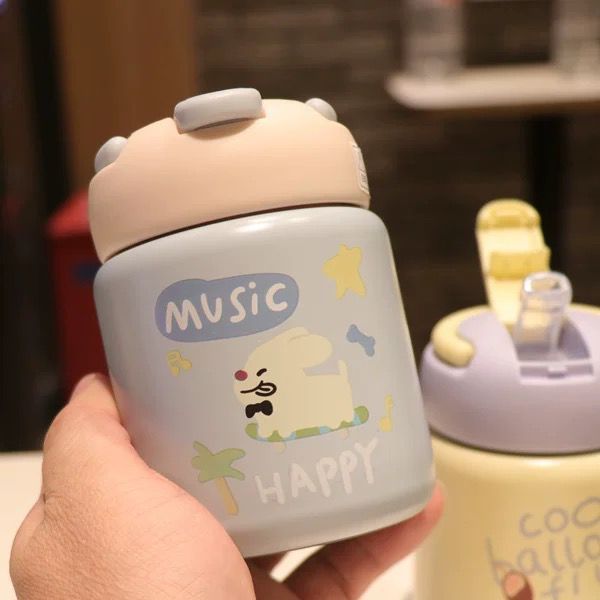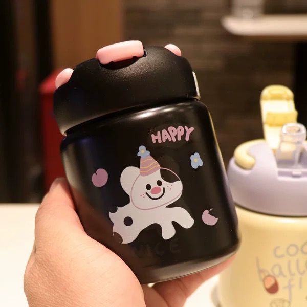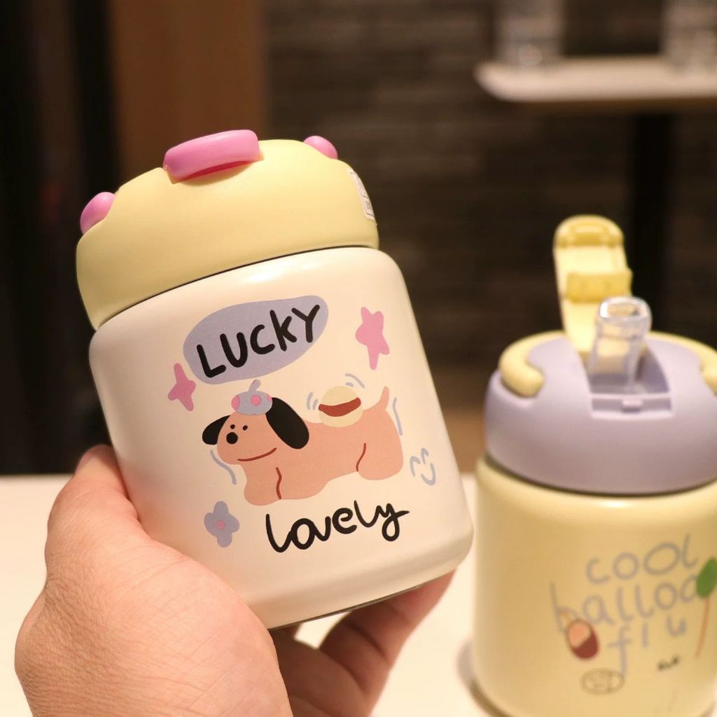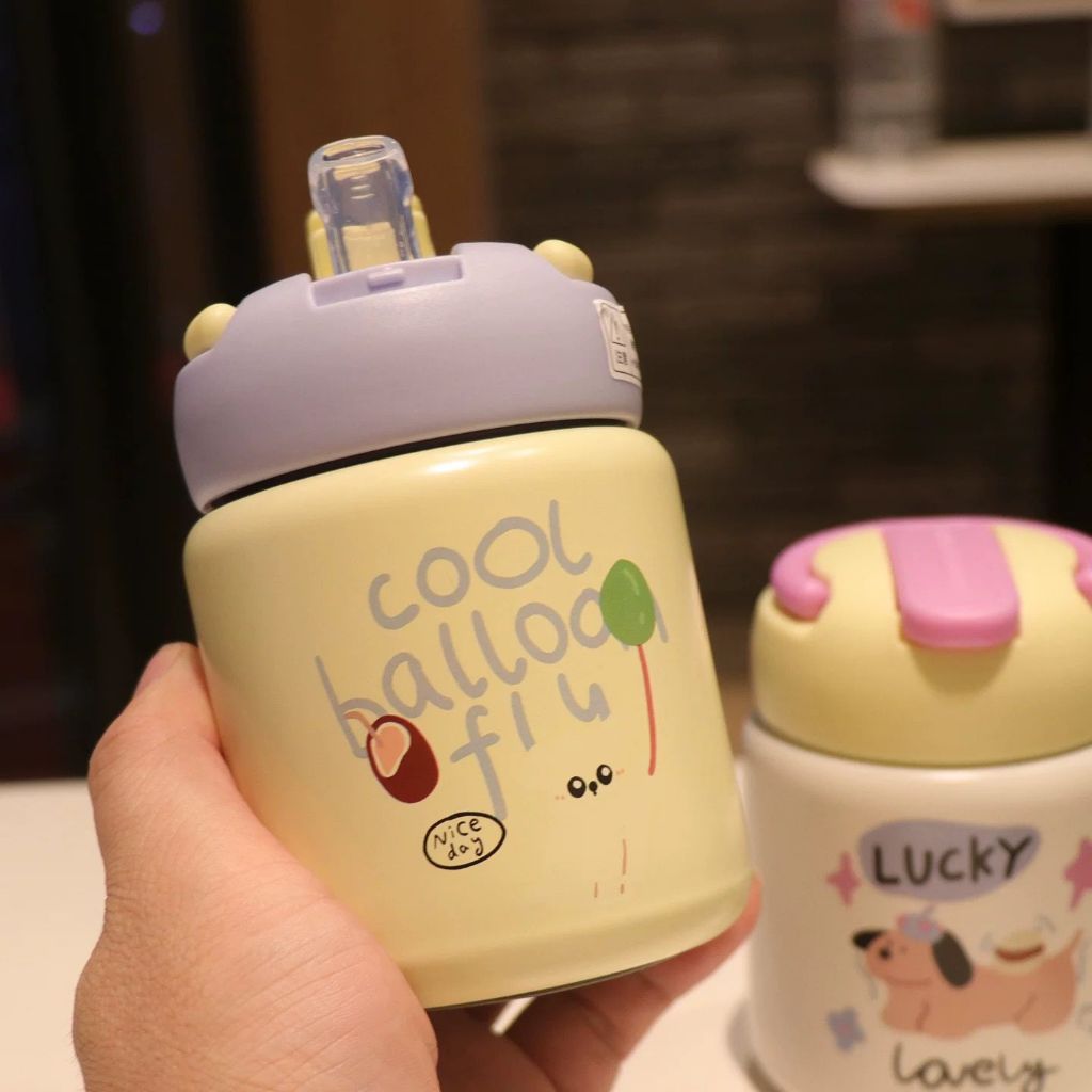 Garrafa Térmica Copo Infantil Aço Inox Com Alça e Canudo Colorida Desenho Animais 260ml Ou 360ml