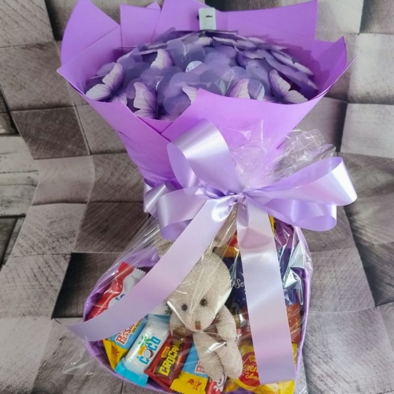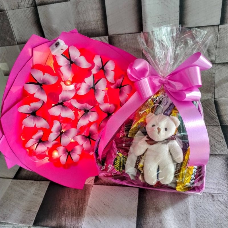 Cesta coração 14 bombons urso chaveiro+mini buquê 15 borboletas pronto para presentear(envio rápido)
