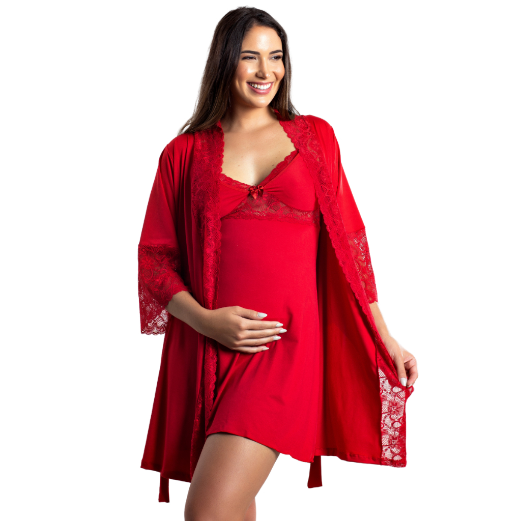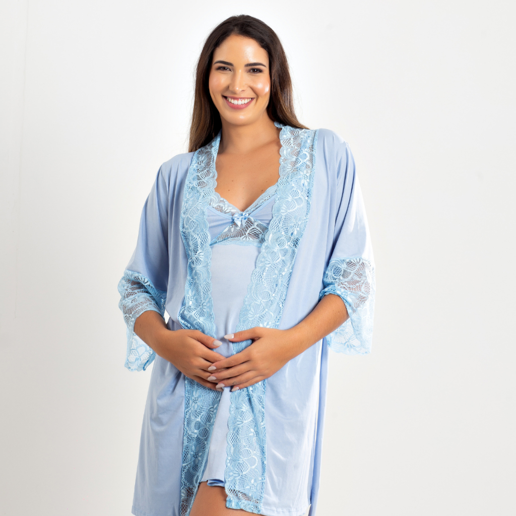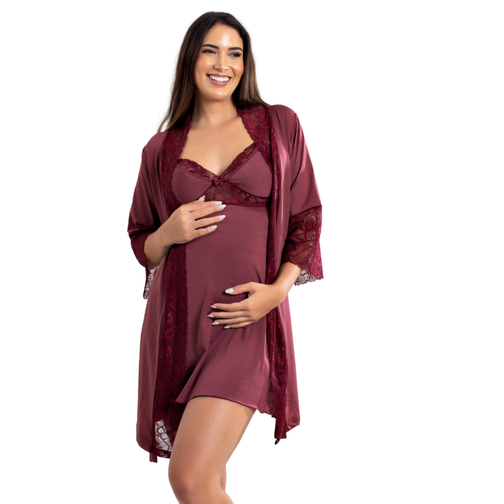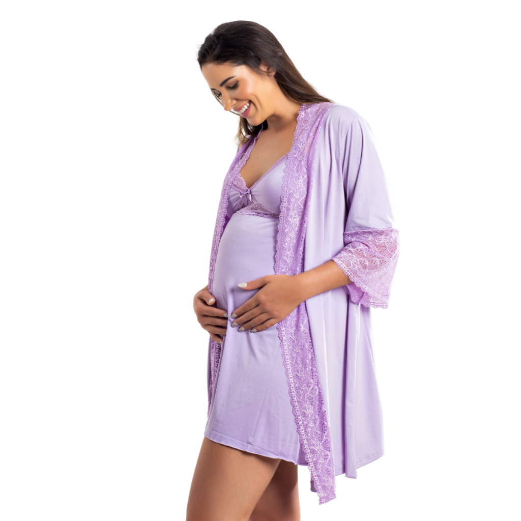 Kit Camisola Amamentação Com Click Frontal e Robe Luxo Maternidade