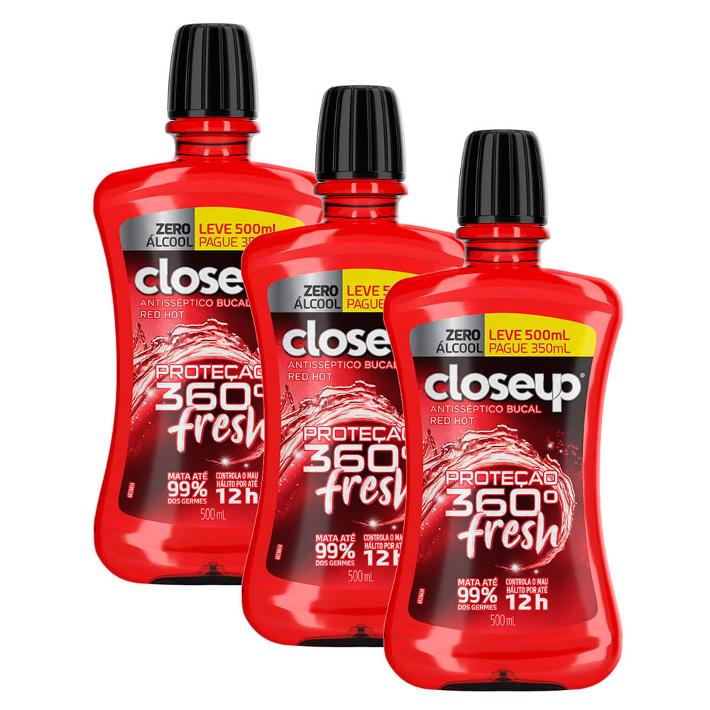 Kit 3 Enxaguante Bucal Closeup Red Hot Proteção 360° Fresh Zero Álcool Leve 500ml Pague 350ml