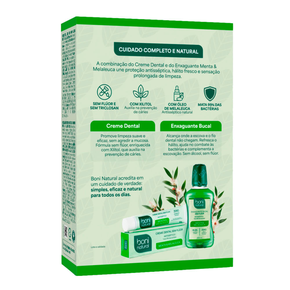 Enxaguante Bucal Boni Natural Menta e Melaleuca Sem Flúor 250ml e Creme Dental Menta e Melaleuca Sem Flúor 90g