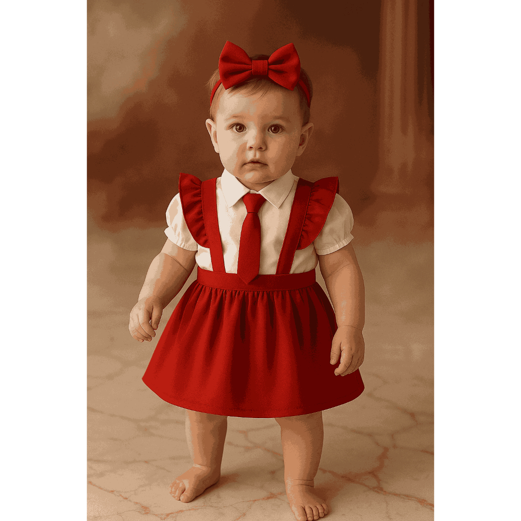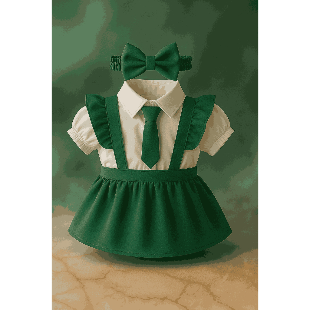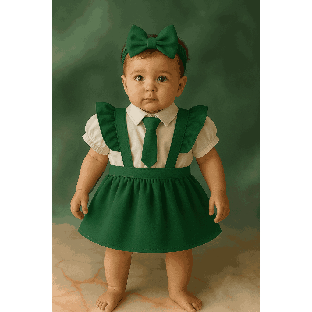 Conjunto Infantil Social Menina – Camisa Branca com Gravata, Saia Preta + Brinde Faixa de Cabelo, Verde Vermelho Preto